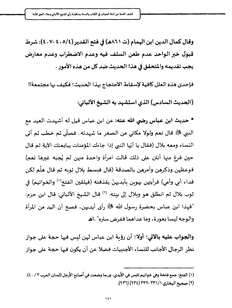 والجواب عليه بالآتي؛ أولا؛ أن رؤية ابن عباس لهن ليس فيها حجة على جواز نظر الرجال الأجانب للنساء الأجنبيات فضلا عن أن يكون فيها حجة على جواز