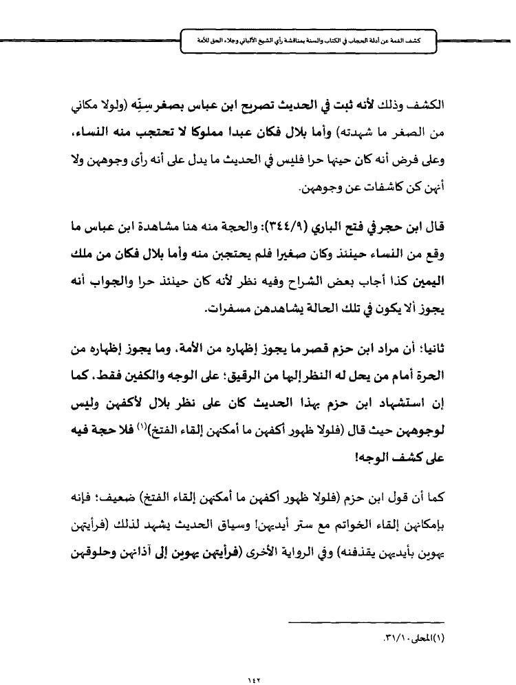 ثانيا؛ أن مراد ابن حزم قصر ما يجوز إظهاره من الأمة، وما يجوز إظهاره من الحرة أمام من يحل له النظر إليها من الرقيق؛ على الوجه والكفين فقط، كما إن استشهاد ابن حزم بهذا الحديث كان على نظر بلال لأكفهن وليس لوجوههن حيث قال (فلولا ظهور أكفهن ما أمكنهن إلقاء الفتخ) (¬١) فلا حجة فيه على كشف الوجه!