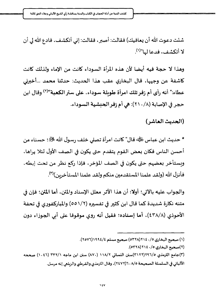 وهذا لا حجة فيه أيضا لأن هذه المرأة السوداء كانت من الإماء ولذلك كانت كاشفة عن وجهها، قال البخاري عقب هذا الحديث: حدثنا محمد ... أخبرني عطاء: " أنه رأى أم زفر تلك امرأة طويلة سوداء، على ستر الكعبة" (¬٢) وقال ابن حجر في الإصابة (٨/ ٢١٠): هي أم زفر الحبشية السوداء.