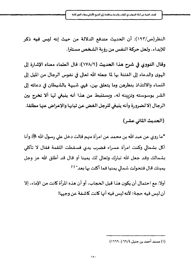 النظر (ص/١٩٣): أن الحديث مندفع الدلالة من حيث إنه ليس فيه ذكر للإبداء، ولعل حركة النفس من رؤية الشخص مستترا.