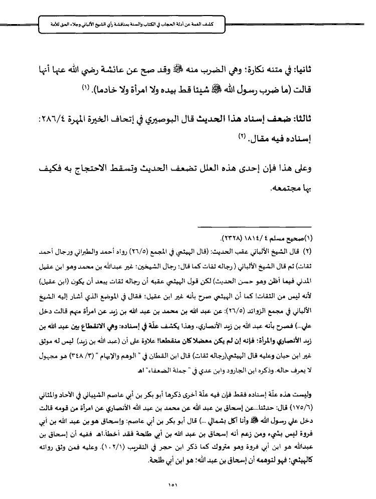 (¬٢) قال الشيخ الألباني عقب الحديث: (قال الهيثمي في المجمع (٥/ ٢٦) رواه أحمد والطبراني ورجال أحمد ثقات) ثم قال الشيخ الألباني (رجاله ثقات كما قال؛ رجال الشيخين؛ غير عبدالله بن محمد وهو ابن عقيل المدني فيما أظن وهو حسن الحديث) لكن قول الهيثمي عقبه أن رجاله ثقات يبعد أن يكون (ابن عقيل) لأنه ليس من الثقات! كما أن الهيثمي صرح بأنه غير ابن عقيل؛ فقال في الموضع الذي أشار إليه الشيخ الألباني في مجمع الزوائد (٥/ ٢٦): عن عبد الله بن محمد بن عبد الله بن زيد عن امرأة منهم قالت دخل علي ... ) فصرح بأنه عبد الله بن زيد الأنصاري، وهذا يكشف علّة في إسناده: وهي الانقطاع بين عبد الله بن زيد الأنصاري والمرأة؛ فإنه إن لم يكن معضلا كان منقطعا! علاوة على أن (عبد الله بن زيد) ليس له موثق غير ابن حبان وعليه قال الهيثمي (رجاله ثقات) قال ابن القطان في " الوهم والإيهام " (٣/ ٣٤٨) هو مجهول لا يعرف حاله. وذكره ابن الجارود وابن عدي في " جملة الضعفاء" اهـ