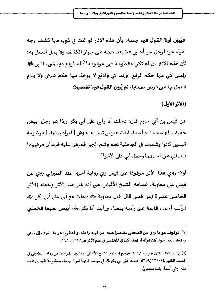 فيُبيّن أولا القول فيها جملة؛ بأن هذه الآثار لو ثبت في شيء منها كشف وجه امرأة حرة لرجل حر أجنبي فلا يعد حجة على جواز الكشف ولا يحل العمل به؛ لأن هذه الآثار إن لم تكن مقطوعة فهي موقوفة (¬١) لم يُرفع منها شيء للنبي - صلى الله عليه وسلم - وليس لأي منها حكم الرفع، وإنما هي وقائع لا يؤخذ منها حكم شرعي ولا يلزم العمل بها على فرض صحتها، ثم يُبيّن القول فيها تفصيلا: