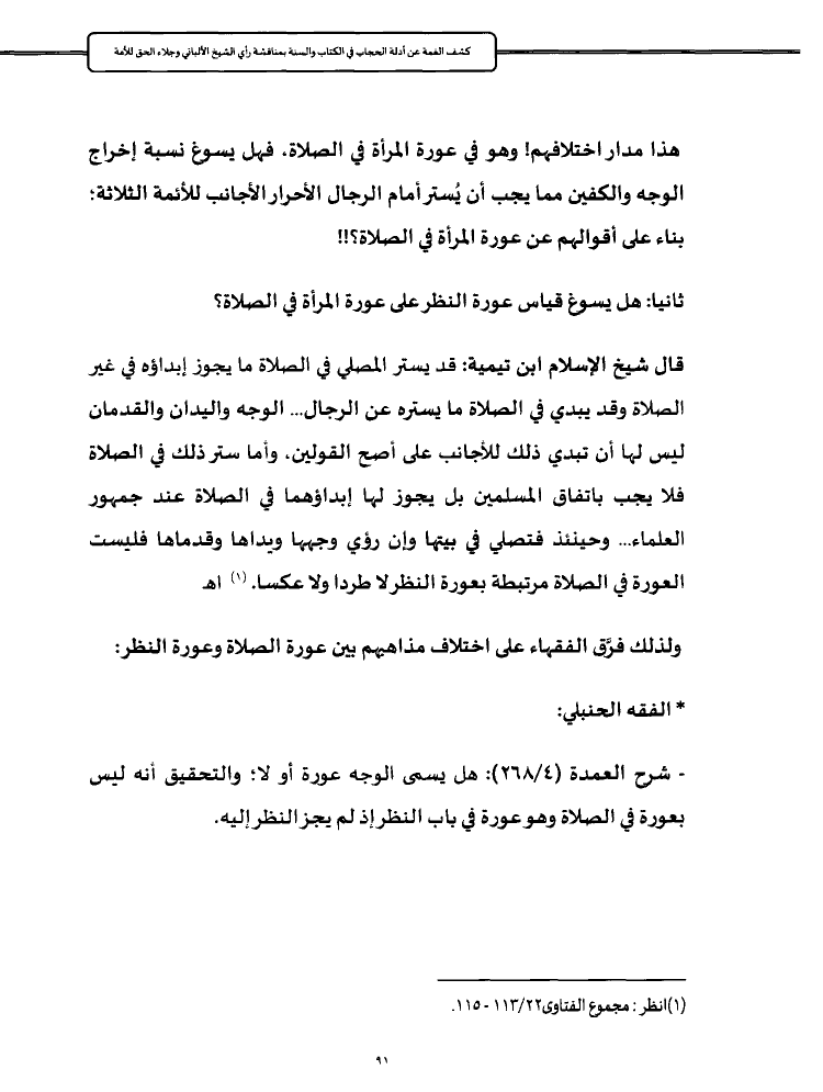 هذا مدار اختلافهم! وهو في عورة المرأة في الصلاة، فهل يسوغ نسبة إخراج الوجه والكفين مما يجب أن يُستر أمام الرجال الأحرار الأجانب للأئمة الثلاثة؛ بناء على أقوالهم عن عورة المرأة في الصلاة؟!!
