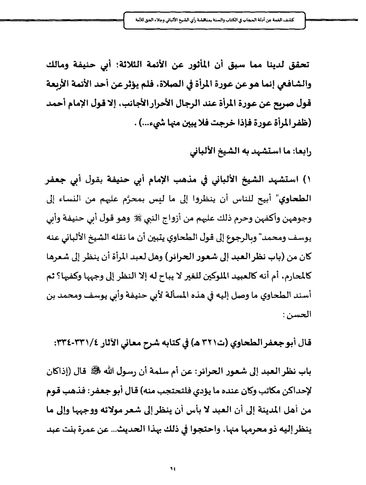 ١) استشهد الشيخ الألباني في مذهب الإمام أبي حنيفة بقول أبي جعفر الطحاوي" أبيح للناس أن ينظروا إلى ما ليس بمحرَّم عليهم من النساء إلى وجوههن وأكفهن وحرم ذلك عليهم من أزواج النبي - صلى الله عليه وسلم - وهو قول أبي حنيفة وأبي يوسف ومحمد" وبالرجوع إلى قول الطحاوي يتبين أن ما نقله الشيخ الألباني عنه كان من (باب نظر العبد إلى شعور الحرائر) وهل لعبد المرأة أن ينظر إلى شعرها كالمحارم، أم أنه كالعبيد الملوكين للغير لا يباح له إلا النظر إلى وجهها وكفيها؟ ثم أسند الطحاوي ما وصل إليه في هذه المسألة لأبي حنيفة وأبي يوسف ومحمد بن الحسن: