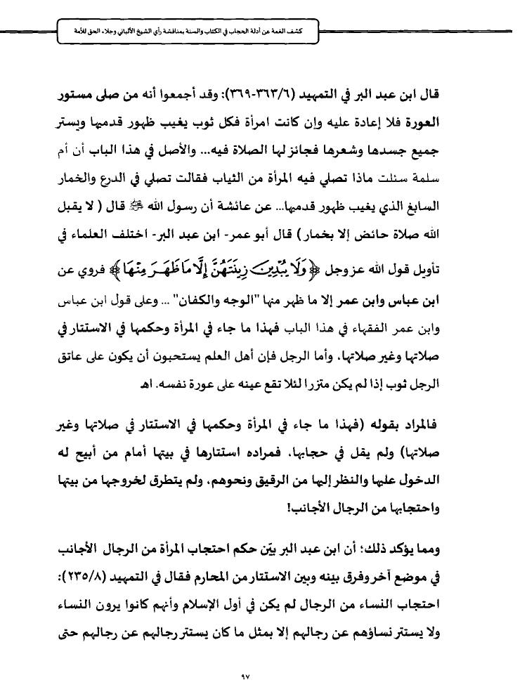 ومما يؤكد ذلك؛ أن ابن عبد البر بيّن حكم احتجاب المرأة من الرجال الأجانب في موضع آخر وفرق بينه وبين الاستتار من المحارم فقال في التمهيد (٨/ ٢٣٥): احتجاب النساء من الرجال لم يكن في أول الإسلام وأنهم كانوا يرون النساء ولا يستتر نساؤهم عن رجالهم إلا بمثل ما كان يستتر رجالهم عن رجالهم حتى