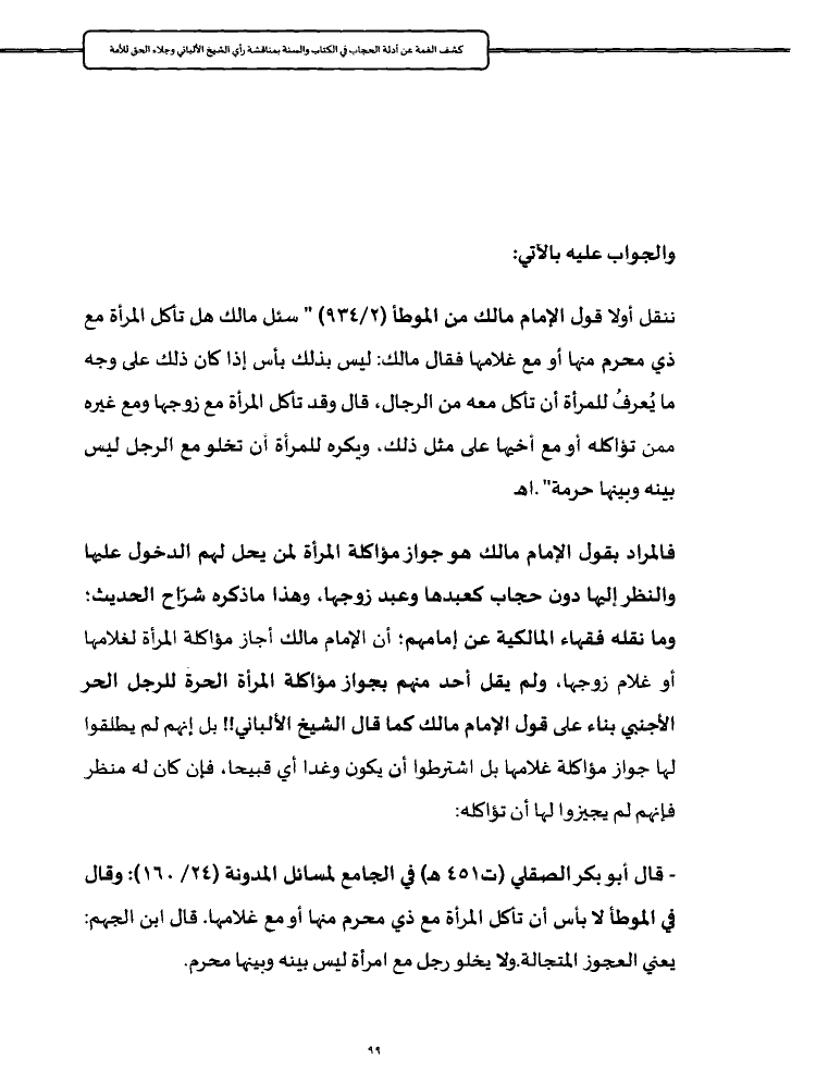 - قال أبو بكر الصقلي (ت ٤٥١ هـ) في الجامع لمسائل المدونة (٢٤/ ١٦٠): وقال في الموطأ لا بأس أن تأكل المرأة مع ذي محرم منها أو مع غلامها. قال ابن الجهم: يعني العجوز المتجالة. ولا يخلو رجل مع امرأة ليس بينه وبينها محرم.