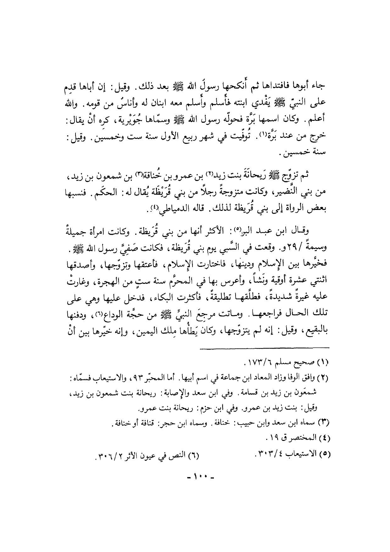 ثمَّ تزوّج [صلى الله عَلَيْهِ وَسلم] رَيحانَةَ بنت زيد بن عَمْرو بن خُناقة بن شَمْعُون بن زيد، من بني النَّضير، وَكَانَت متزوجةً رجلا من بني قُرَيْظَة يُقال لَهُ: الحكَم. فنسبها بعض الروَاة إِلَى بني قُرَيظة لذَلِك. قَالَه الدمياطي.
