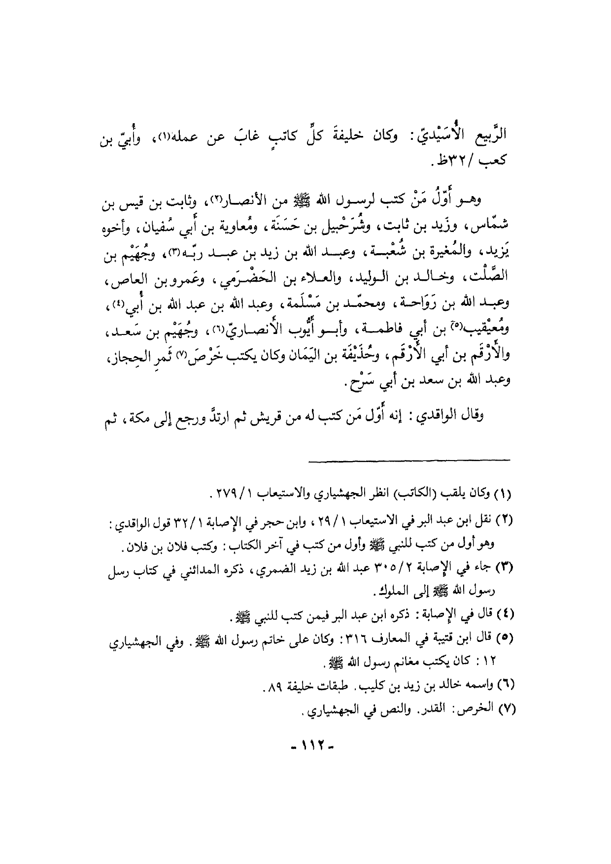 الرَّبيع الأُسَيْديّ: وَكَانَ خليفةَ كلِّ كاتبٍ غابَ عَن عمله، وأُبيّ بن كَعْب / 32 ظ.