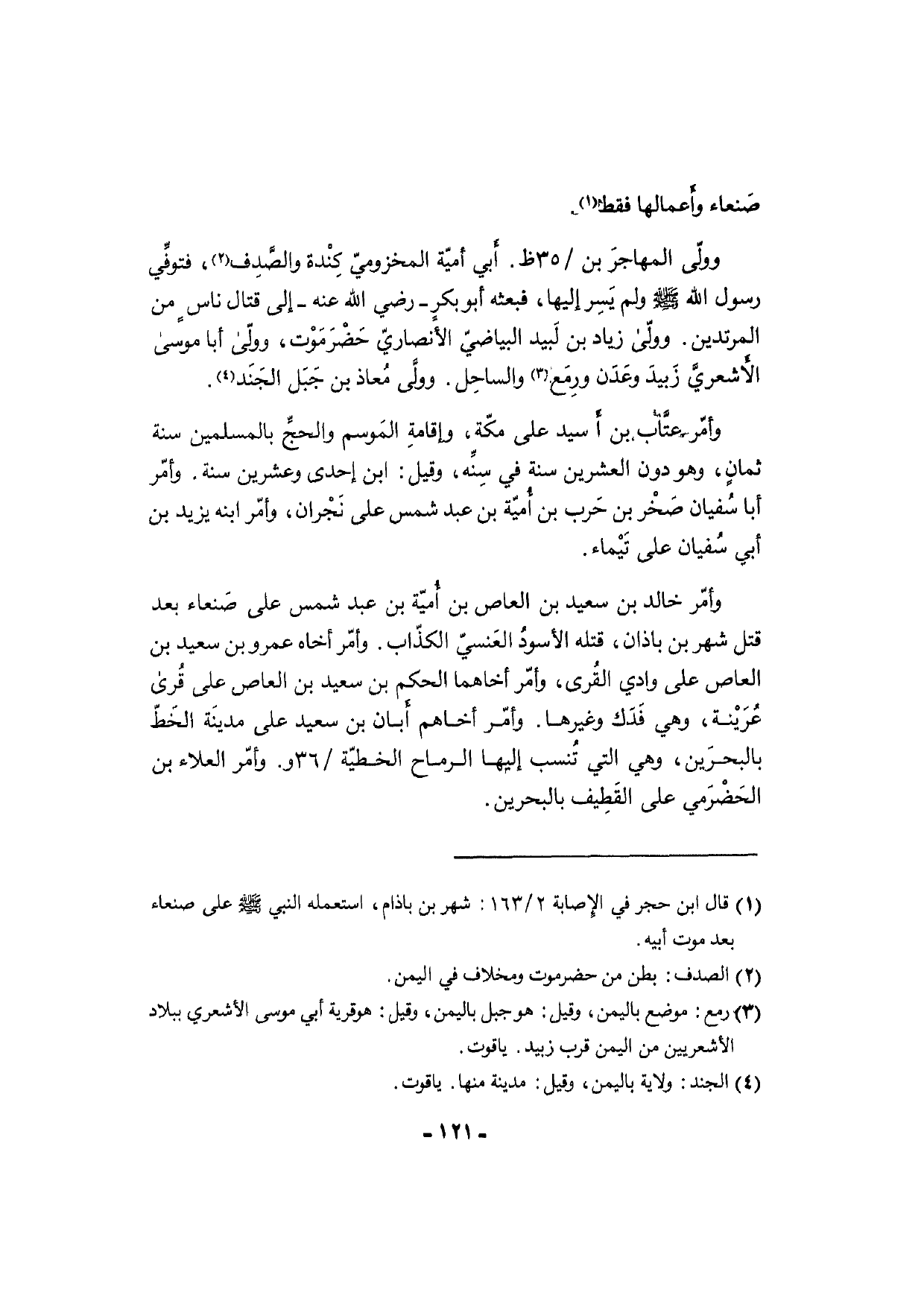 وولّى المهاجرَ بن / 35 ظ. أَبي أميّة المخزوميّ كِنْدة والصَّدِف، فتوفِّي رَسُول الله [صلى الله عَلَيْهِ وَسلم] وَلم يَسِر إِلَيْهَا، فَبَعثه أَبُو بكر - رَضِي الله عَنهُ - إِلَى قتال ناسٍ من الْمُرْتَدين. وولّى زِيَاد بن لَبيد البياضيّ الأنصاريّ حَضْرَمَوْت، وولّى أَبَا مُوسَى الأَشعريَّ زَبيدَ وعَدَن ورِمَع والساحِل. وولَّى مُعاذ بن جَبَل الجَنَد.