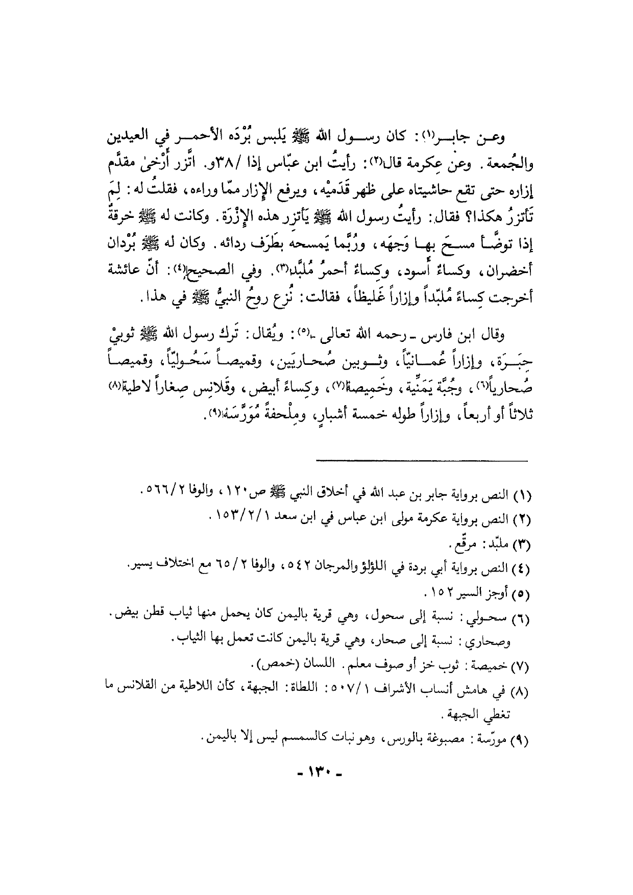 وَعَن جَابر: كَانَ رَسُول الله [صلى الله عَلَيْهِ وَسلم] يَلبس بُرْدَه الْأَحْمَر فِي الْعِيدَيْنِ والجُمعة. وَعَن عِكرمة قَالَ: رأيتُ ابْن عبّاس إِذا / 38 و. أتَّزر أَرْخى مقدَّم إزَاره حَتَّى تقع حاشيتاه على ظهر قَدَميْه، وَيرْفَع الإِزار ممّا وَرَاءه، فقلتُ لَهُ: لِمَ تأَتزرُ هَكَذَا؟ فَقَالَ: رأيتُ رَسُول الله [صلى الله عَلَيْهِ وَسلم] يَأتزِر هَذِه الإِزْرَة. وَكَانَت لَهُ [صلى الله عَلَيْهِ وَسلم] خرقةٌ إِذا توضَّأ مسحَ بهَا وَجهَه، ورُبَّما يَمسحه بطَرَف رِدَائه. وَكَانَ لَهُ [صلى الله عَلَيْهِ وَسلم] بُرْدان أخضران، وكساءٌ أَسود، وكِساءٌ أحمرُ مُلبَّد. وَفِي الصَّحِيح: أنّ عَائِشَة أخرجت كِساءً مُلبّداً وإزاراً غَليظاً، فَقَالَت: نُزع روحُ النبيُّ [صلى الله عَلَيْهِ وَسلم] فِي هَذَا.