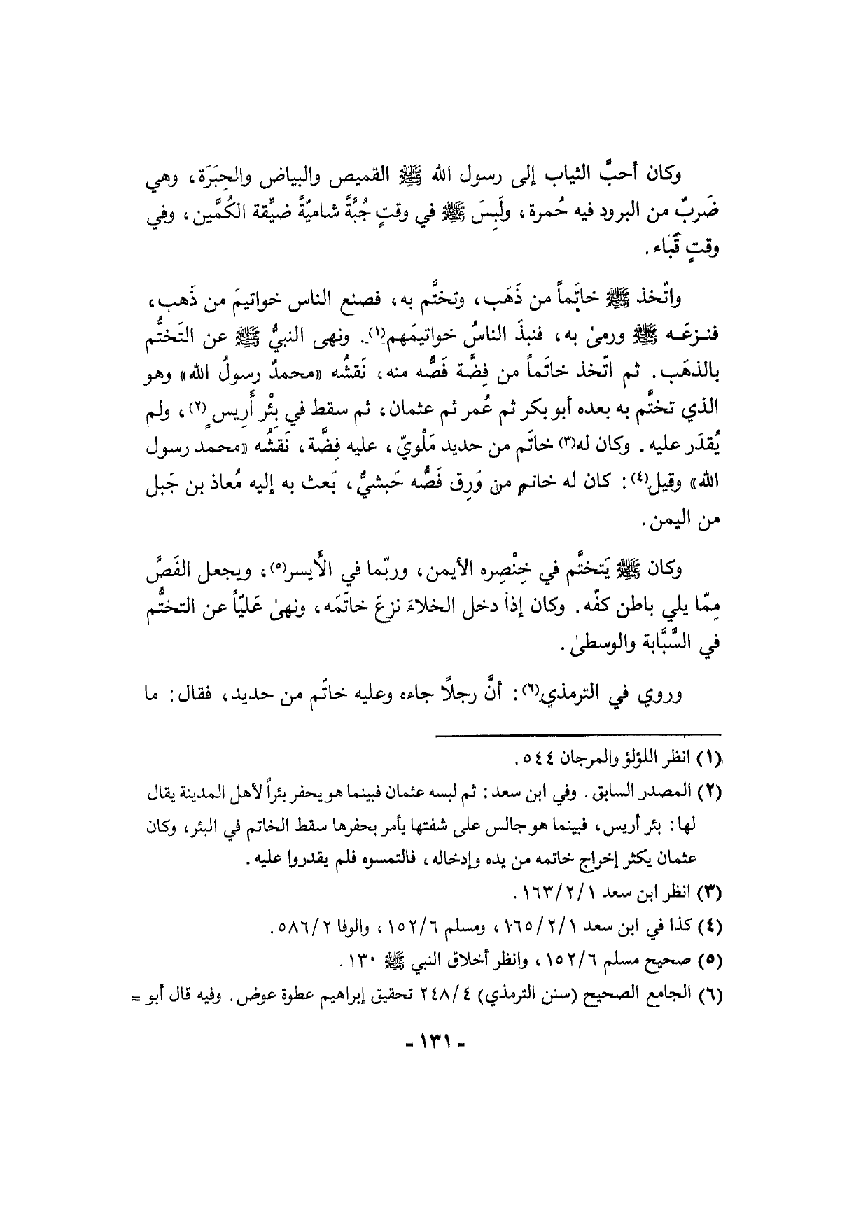 وَكَانَ أحبَّ الثِّيَاب إِلَى رَسُول الله [صلى الله عَلَيْهِ وَسلم] الْقَمِيص وَالْبَيَاض والحِبَرة، وَهِي ضَربٌ من البرود فِيهِ حُمرة، ولَبِسَ [صلى الله عَلَيْهِ وَسلم] فِي وقتٍ جُبَّةً شاميّةً ضيِّقة الكُمَّين، وَفِي وقتٍ قبَاء.
