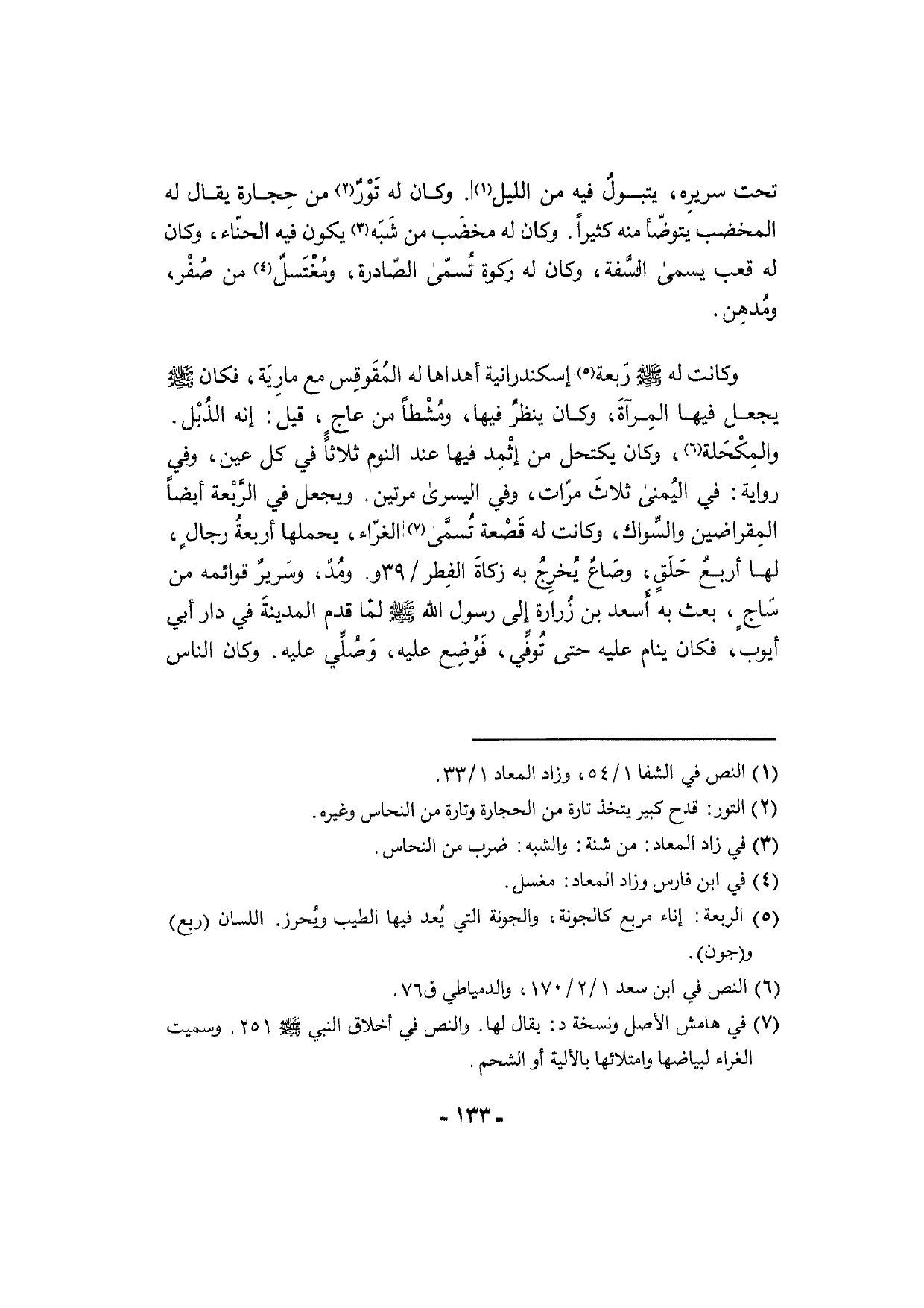 وَكَانَت لَهُ [صلى الله عَلَيْهِ وَسلم] رَبعة إسكندرانية أهداها لَهُ المُقَوقِس مَعَ مارِيَة، فَكَانَ [صلى الله عَلَيْهِ وَسلم] يَجْعَل فِيهَا المِرآةَ، وَكَانَ ينظرُ فِيهَا، ومُشْطاً من عاجٍ، قيل: إِنَّه الذُبْل. والمِكْحَلة، وَكَانَ يكتحل من إثْمِد فِيهَا عِنْد النّوم ثَلَاثًا فِي كل عين، وَفِي رِوَايَة: فِي اليُمنى ثَلَاث مرّات، وَفِي الْيُسْرَى مرَّتَيْنِ. وَيجْعَل فِي الرَّبْعة أَيْضا المِقراضين والسِّواك، وَكَانَت لَهُ قَصْعة تُسمَّى الغرّاء، يحملهَا أربعةُ رجالٍ، لَهَا أربعُ حَلَقٍ، وصَاعٌ يُخرجُ بِهِ زكاةَ الفِطر / 39 و. ومُدٌ، وسَريرٌ قوائمه من سَاجٍ، بعث بِهِ أَسعد بن زُرارة إِلَى رَسُول الله [صلى الله عَلَيْهِ وَسلم] لمّا قدم الْمَدِينَة فِي دَار أبي أَيُّوب، فَكَانَ ينَام عَلَيْهِ حَتَّى تُوفِّي، فَوُضِع عَلَيْهِ، وَصُلِّي عَلَيْهِ. وَكَانَ النَّاس