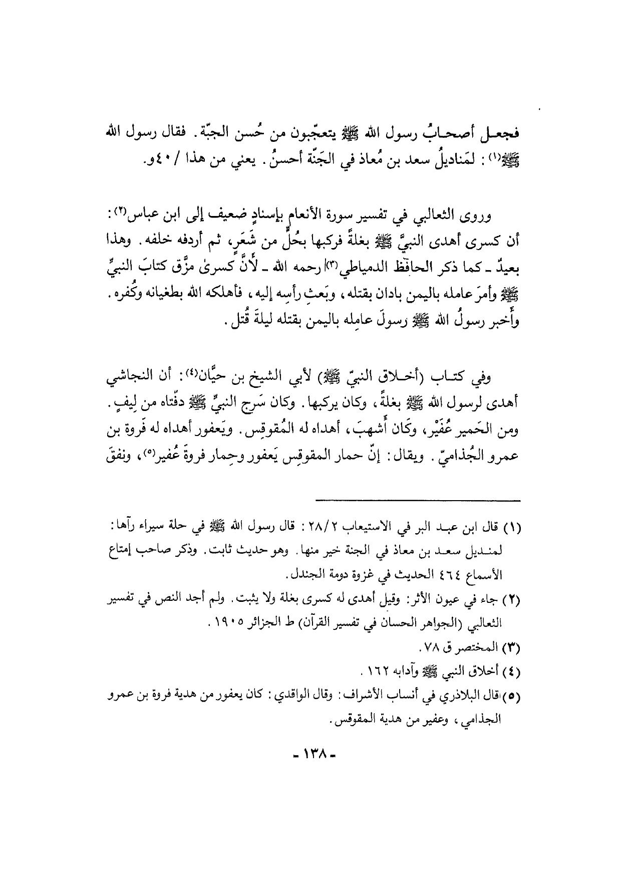وروى الثعالبي فِي تَفْسِير سُورَة الْأَنْعَام بإسنادٍ ضَعِيف إِلَى ابْن عَبَّاس: أَن كسْرَى أهْدى النبيَّ [صلى الله عَلَيْهِ وَسلم] بغلة فركبها بحُلٍّ من شَعَرٍ، ثمَّ أردفه خَلفه. وَهَذَا بعيدٌ - كَمَا ذكر الْحَافِظ الدمياطي رَحمَه الله - لأَنَّ كسْرَى مزَّق كتابَ النبيِّ [صلى الله عَلَيْهِ وَسلم] وأمرَ عَامله بِالْيمن بادان بقتْله، وبَعثِ رأسِه إِلَيْهِ، فَأَهْلَكَهُ الله بطغيانه وكفره. وأَخبر رسولُ الله [صلى الله عَلَيْهِ وَسلم] رسولَ عامِله بِالْيمن بقتْله ليلةَ قُتل.
