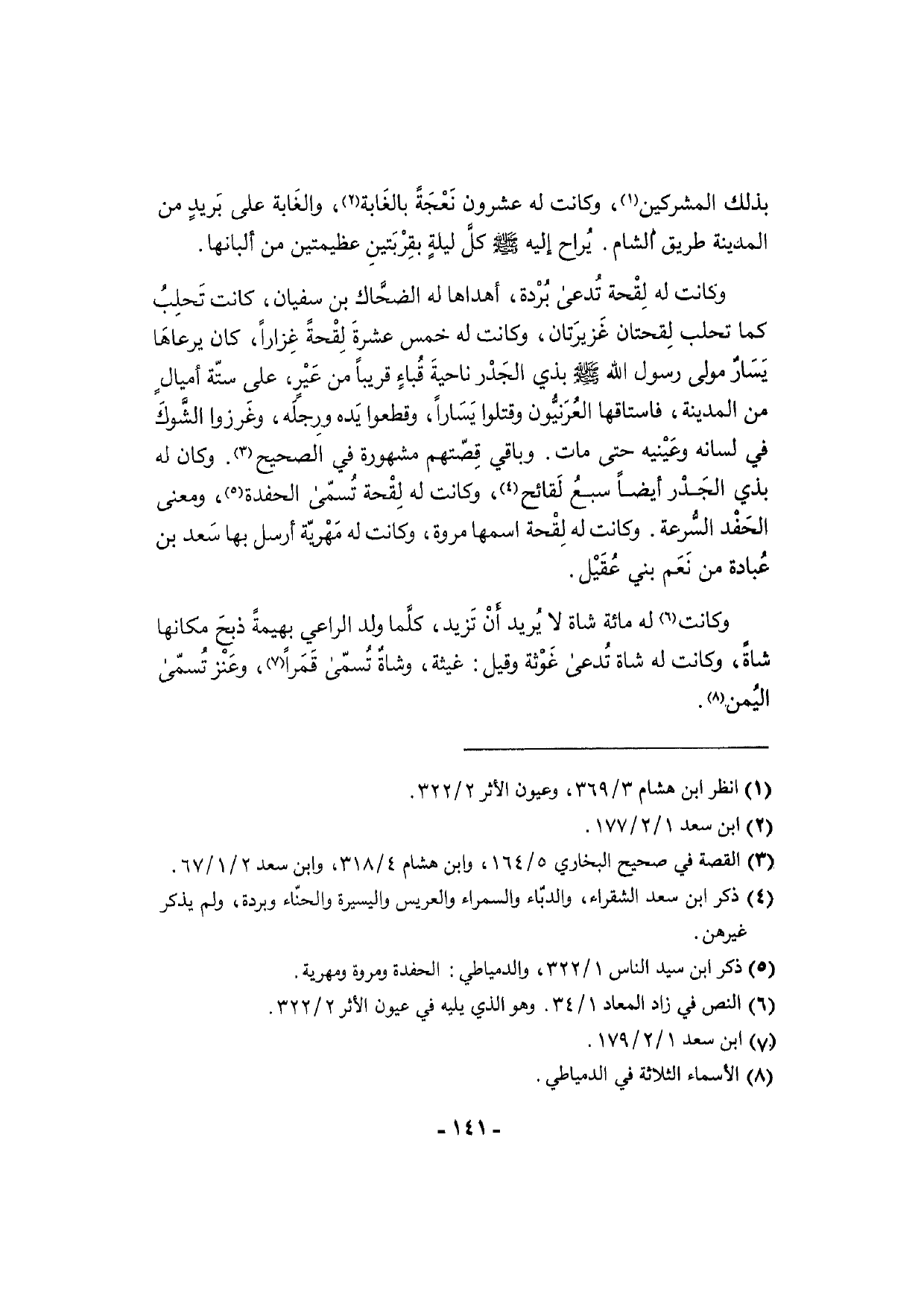 بذلك الْمُشْركين، وَكَانَت لَهُ عشرُون نَعْجَةً بالغَابة، والغَابة على بَريدٍ من الْمَدِينَة طَرِيق الشَّام. يُراح إِلَيْهِ [صلى الله عَلَيْهِ وَسلم] كلَّ ليلةٍ بِقْرَبتينِ عظيمتين من أَلْبَانهَا.