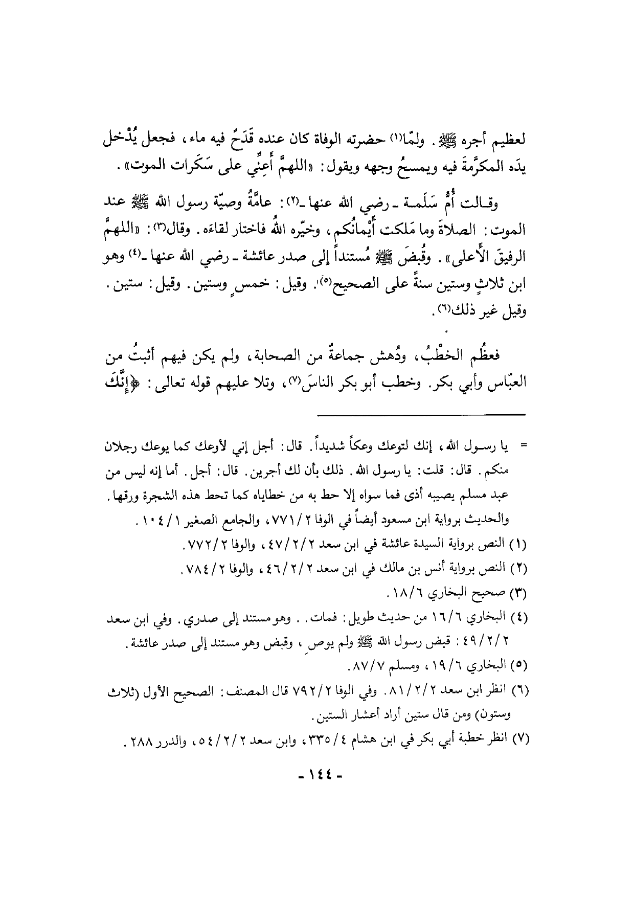 لعَظيم أجره [صلى الله عَلَيْهِ وَسلم] . ولمّا حَضرته الْوَفَاة كَانَ عِنْده قَدَحٌ فِيهِ مَاء، فَجعل يُدْخل يدَه المكرَّمةَ فِيهِ ويمسحُ وَجهه وَيَقُول: " اللهمَّ أَعِنِّي على سَكَرات الْمَوْت ".