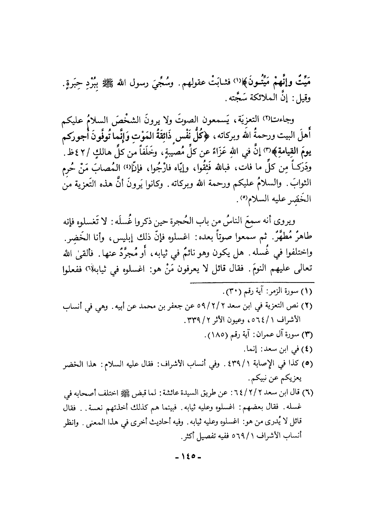 مَيِّتٌ وإنَّهمْ مَيِّتُونَ} فثابَتْ عُقُولهمْ. وسُجِّيَ رَسُول الله [صلى الله عَلَيْهِ وَسلم] بِبُرْدِ حِبَرةٍ وَقيل: إنَّ الْمَلَائِكَة سَجَّته.