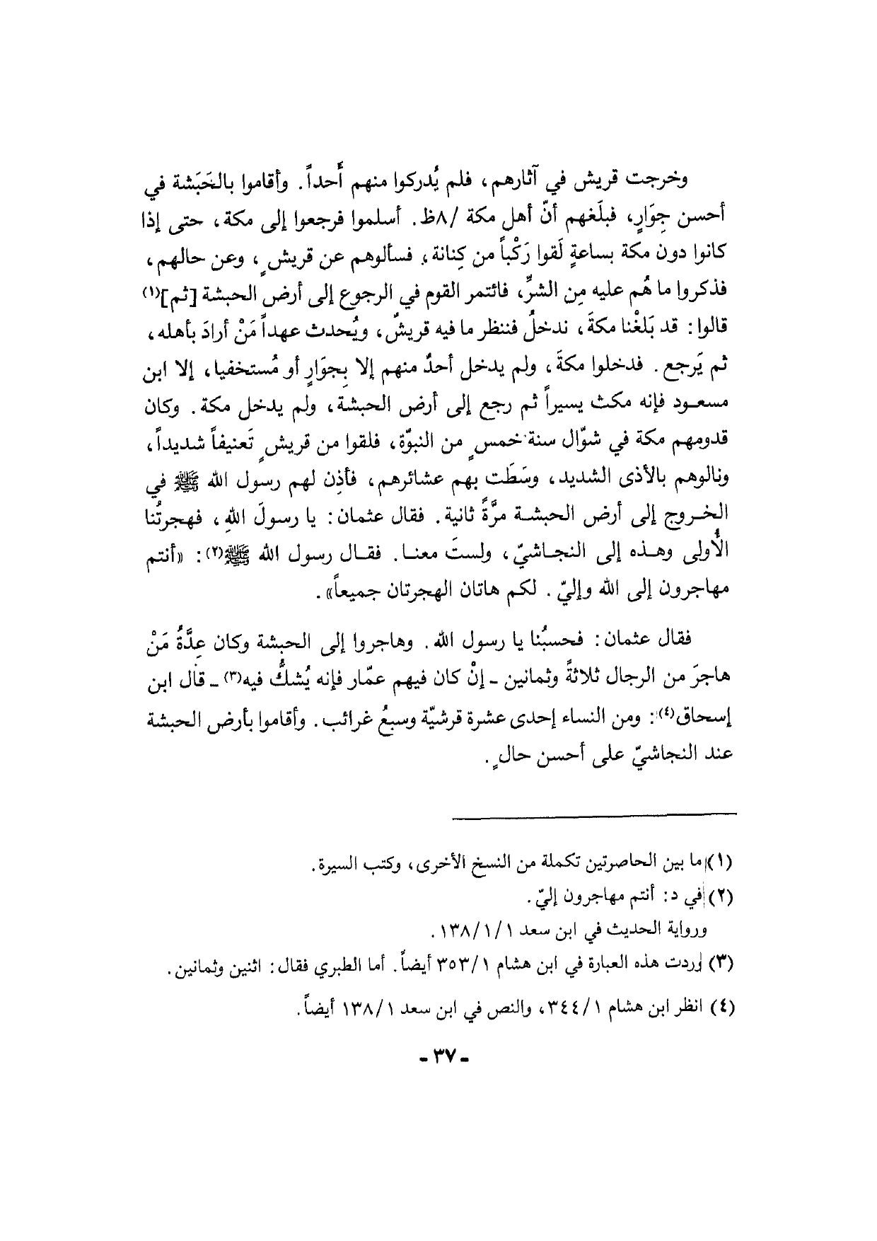 وَخرجت قُرَيْش فِي آثَارهم، فَلم يُدركوا مِنْهُم أَحداً. وَأَقَامُوا بالحَبَشة فِي أحسن جِوَارٍ، فبلَغهم أنّ أهل مَكَّة / 8 ظ. أَسْلمُوا فَرَجَعُوا إِلَى مَكَّة، حَتَّى إِذا كَانُوا دون مَكَّة بساعةٍ لَقوا رَكْباً من كِنانة، فَسَأَلُوهُمْ عَن قريشٍ، وَعَن حَالهم، فَذكرُوا مَا هُم عَلَيْهِ مِن الشرِّ، فائتمر الْقَوْم فِي الرُّجُوع إِلَى أَرض الْحَبَشَة [ثمَّ] قَالُوا: قد بَلغْنا مكةَ، ندخلُ فَنَنْظُر مَا فِيهِ قريشٌ، ويُحدث عهدا مَنْ أرادَ بأَهْله، ثمَّ يَرجع. فَدَخَلُوا مكةَ، وَلم يدْخل أحدٌ مِنْهُم إِلَّا بجوَارٍ أَو مُستخفيا، إِلَّا ابْن مَسْعُود فَإِنَّهُ مكث يَسِيرا ثمَّ رَجَعَ إِلَى أَرض الْحَبَشَة، وَلم يدْخل مَكَّة. وَكَانَ قدومهم مَكَّة فِي شوّال سنة خمسٍ من النبوّة، فَلَقوا من قُرَيْش تَعنيفاً شَدِيدا، ونالوهم بالأذى الشَّديد، وسَطَت بهم عَشَائِرهمْ، فأذِن لَهُم رَسُول الله [صلى الله عَلَيْهِ وَسلم] فِي الْخُرُوج إِلَى أَرض الْحَبَشَة مرَّةً ثَانِيَة. فَقَالَ عُثْمَان: يَا رسولَ اللهِ، فهجرتُنا الأولى وَهَذِه إِلَى النجاشيّ، ولستَ مَعنا. فَقَالَ رَسُول الله [صلى الله عَلَيْهِ وَسلم] : " أَنْتُم مهاجرون إِلَى الله وإليّ. لكم هَاتَانِ الهجرتان جَمِيعًا " فَقَالَ عُثْمَان: فحسبُنا يَا رَسُول الله. وَهَاجرُوا إِلَى الْحَبَشَة وَكَانَ عِدَّةُ مَنْ هاجرَ من الرِّجَال ثَلَاثَة وَثَمَانِينَ - إنْ كَانَ فيهم عمّار فَإِنَّهُ يُشكُّ فِيهِ - قَالَ ابْن إِسْحَاق: وَمن النِّسَاء إِحْدَى عشرَة قرشيّة وسبعُ غرائب. وَأَقَامُوا بِأَرْض الْحَبَشَة عِنْد النجاشيّ على أحسن حالٍ.