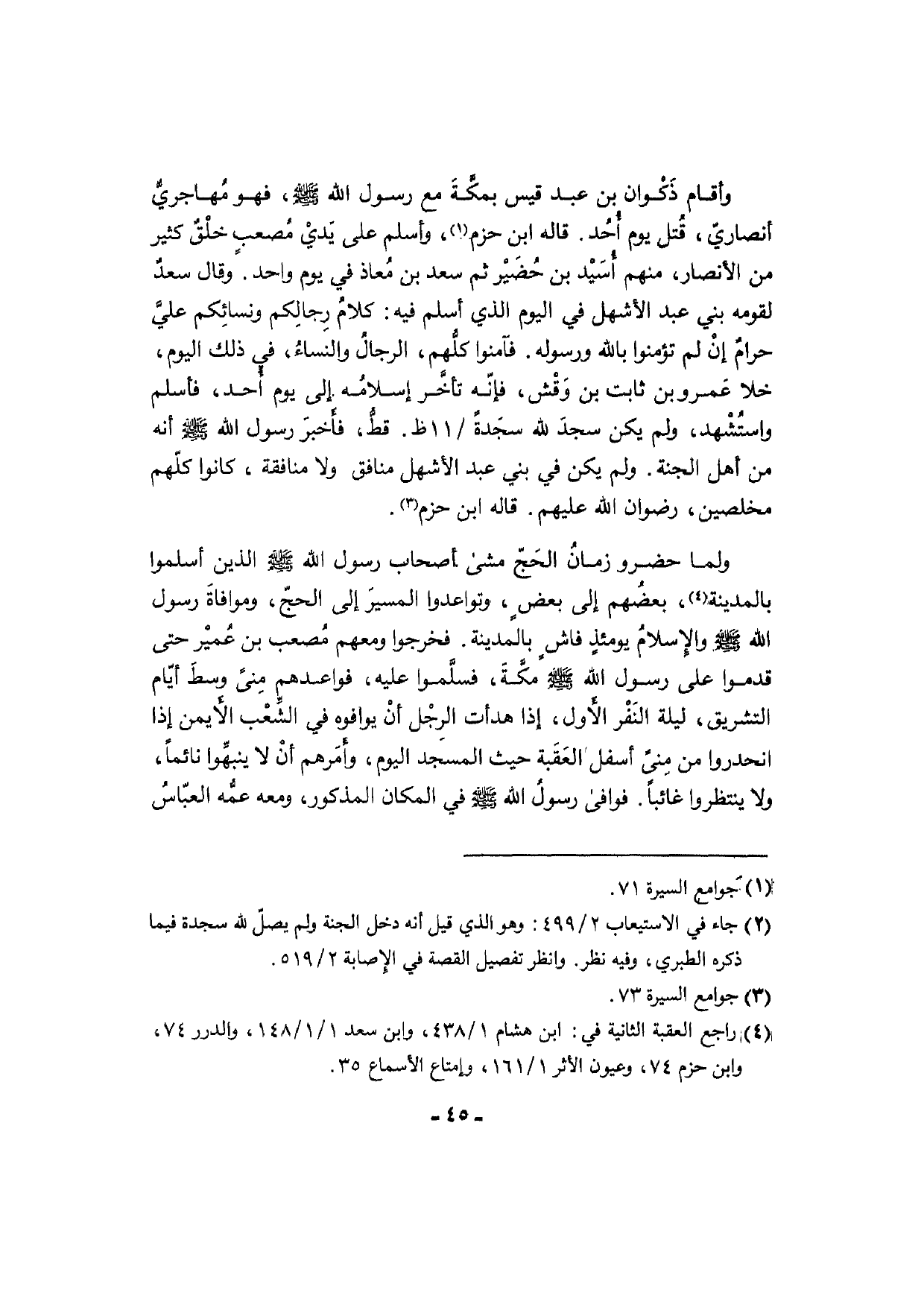 وَأقَام ذَكْوان بن عبد قيس بمكَّةَ مَعَ رَسُول الله [صلى الله عَلَيْهِ وَسلم] ، فَهُوَ مُهاجريٌّ أنصاريّ، قُتل يَوْم أُحُد. قَالَه ابْن حزم، وَأسلم على يَديْ مُصعبٍ خلْقٌ كثير من الْأَنْصَار، مِنْهُم أُسَيْد بن حُضَيْر ثمَّ سعد بن مُعاذ فِي يَوْم وَاحِد. وَقَالَ سعدٌ لِقَوْمِهِ بني عبد الْأَشْهَل فِي الْيَوْم الَّذِي أسلم فِيهِ: كلامُ رِجالِكم ونسائِكم عليَّ حرامٌ إنْ لم تؤمنوا بِاللَّه وَرَسُوله. فآمنوا كلُّهم، الرجالُ والنساءُ، فِي ذَلِك الْيَوْم، خلا عَمرو بن ثَابت بن وَقْش، فَإِنَّهُ تأخَّر إسلامُه إِلَى يَوْم أُحد، فَأسلم واستُشْهد، وَلم يكن سجدَ لله سجَدةً / 11 ظ. قطُّ، فأَخبرَ رَسُول الله [صلى الله عَلَيْهِ وَسلم] أَنه من أهل الْجنَّة. وَلم يكن فِي بني عبد الْأَشْهَل مُنَافِق وَلَا منافقة، كَانُوا كلّهم مُخلصين، رضوَان الله عَلَيْهِم. قَالَه ابْن حزم.