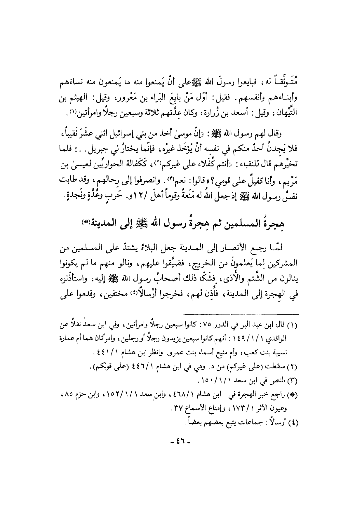 وَقَالَ لَهُم رَسُول الله [صلى الله عَلَيْهِ وَسلم] : " إنّ مُوسَى أَخذ من بني إِسْرَائِيل اثْنَي عشَرَ نَقِيبًا، فَلَا يَجِدنَّ أحدٌ مِنْكُم فِي نَفسه أنْ يُؤخَذ غيرُه، فإنّما يختارُ لي جِبْرِيل. . " فَلَمَّا تخيَّرهم قَالَ للنقباء: " أَنْتُم كُفَلاء على غَيْركُمْ، كَكَفالة الحواريِّين لعيسى بن مَرْيم، وَأَنا كفيلٌ على قومِي؟ " قَالُوا: نعم. وَانْصَرفُوا إِلَى رِحالهم، وَقد طابت نفس رَسُول الله [صلى الله عَلَيْهِ وَسلم] إِذْ جعل اللهُ لَهُ مَنَعةً وقوماً أهلَ / 12 و. حَربٍ وعُدَّةٍ ونَجدةٍ