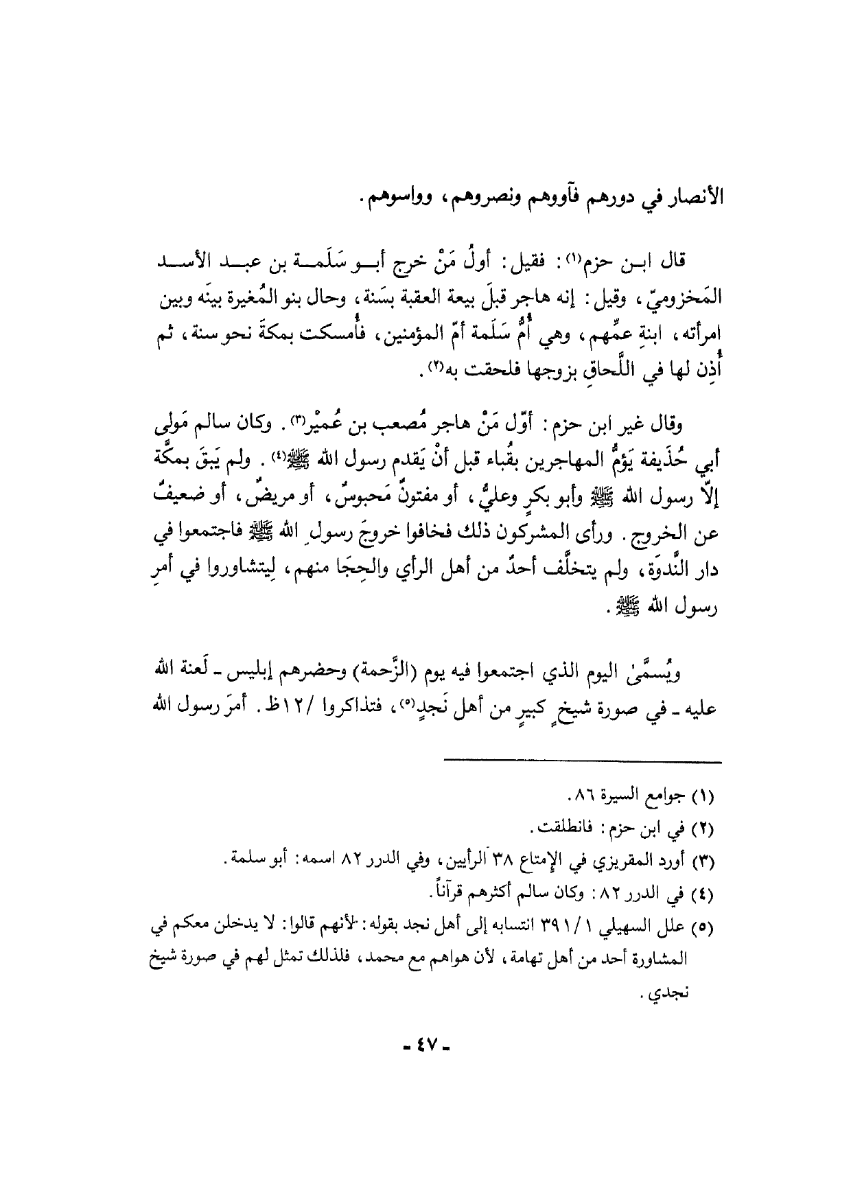 وَقَالَ غير ابْن حزم: أوّل مَنْ هَاجر مُصعب بن عُميرْ. وَكَانَ سَالم مَولى أبي حُذَيفة يَؤمُّ الْمُهَاجِرين بقُباء قبل أنْ يَقدم رَسُول الله [صلى الله عَلَيْهِ وَسلم] . وَلم يَبقَ بمكَّة إلاّ رَسُول الله [صلى الله عَلَيْهِ وَسلم] وَأَبُو بكرٍ وعليُّ، أَو مفتونٌ مَحبوسٌ، أَو مريضٌ، أَو ضعيفٌ عَن الْخُرُوج. وَرَأى الْمُشْركُونَ ذَلِك فخافوا خروجَ رسولِ الله [صلى الله عَلَيْهِ وَسلم] فَاجْتمعُوا فِي دَار النَّدوَة، وَلم يتخلَّف أحدٌ من أهل الرَّأْي والحِجَا مِنْهُم، لِيتشاوروا فِي أمرِ رَسُول الله [صلى الله عَلَيْهِ وَسلم] .