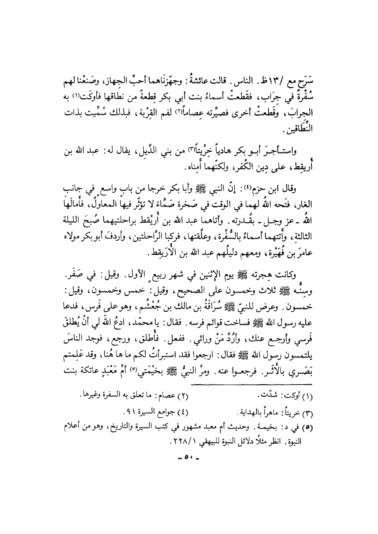 سَرَح مَعَ / 13 ظ. النَّاس. قَالَت عائشةُ: وجهّزنَاهما أحبَّ الجِهاز، وصَنعْنا لَهُم سُفْرة فِي جِرَاب، فقَطعتْ أسماءُ بنت أبي بكر قِطعةً من نطاقها فأوكَت بِهِ الجرابَ، وقَطعتْ أُخْرَى فصيَّرته عِصاماً لفم القِرْبة، فبذلك سُمِّيت بِذَات النِّطَاقين.