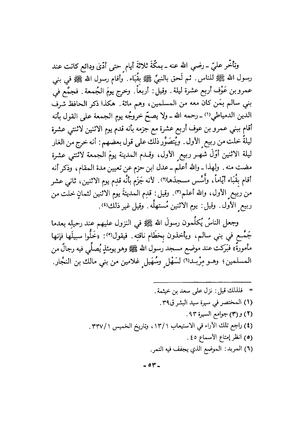 وتأخّر عليّ - رَضِي الله عَنهُ - بمكّةَ ثلاثةَ أيامٍ حَتَّى أدّى ودائع كَانَت عِنْد رَسُول الله [صلى الله عَلَيْهِ وَسلم] للنَّاس. ثمَّ لَحق بالنبيِّ [صلى الله عَلَيْهِ وَسلم] بقُبَاء. وَأقَام رَسُول الله [صلى الله عَلَيْهِ وَسلم] فِي بني عَمْرو بن عَوْف أَربع عشرَة لَيْلَة. وَقيل: أَرْبعا. وَخرج يومَ الجُمعة. فجمَّع فِي بني سَالم بمَن كَانَ مَعَه من الْمُسلمين، وهم مائَة. هَكَذَا ذكر الْحَافِظ شرف الدّين الدمياطي - رَحمَه الله - وَلَا يصحّ خروجُه يَوْم الْجُمُعَة على القَوْل بِأَنَّهُ أَقَامَ ببني عَمْرو بن عَوْف أَربع عشرَة مَعَ جزمه بِأَنَّهُ قدم يَوْم الِاثْنَيْنِ لِاثْنَتَيْ عشرَة لَيْلَة خلت من ربيعٍ الأول. ويُتصوَّر ذَلِك على قَول بَعضهم: أَنه خرج من الْغَار لَيْلَة الِاثْنَيْنِ أوّلَ شهر ربيعٍ الأول، وَقدم الْمَدِينَة يومَ الْجُمُعَة لِاثْنَتَيْ عشرَة مَضَت مِنْهُ. وَلِهَذَا - وَالله أعلم - عدل ابْن حزم عَن تعْيين مُدَّة الْمقَام، وَذكر أَنه أَقَامَ بِقُبَاء أيّاماً، وأَسَّس مسجدَها. لِأَنَّهُ جَزَم بأنَّه قِدم يَوْم الِاثْنَيْنِ، ثَانِي عشر من ربيعٍ الأول، وَالله أعلم. وَقيل: قدِم المدينةَ يَوْم الِاثْنَيْنِ لثمانٍ خلت من ربيعٍ الأول. وَقيل: يَوْم الِاثْنَيْنِ مُستهلَّه. وَقيل غير ذَلِك.