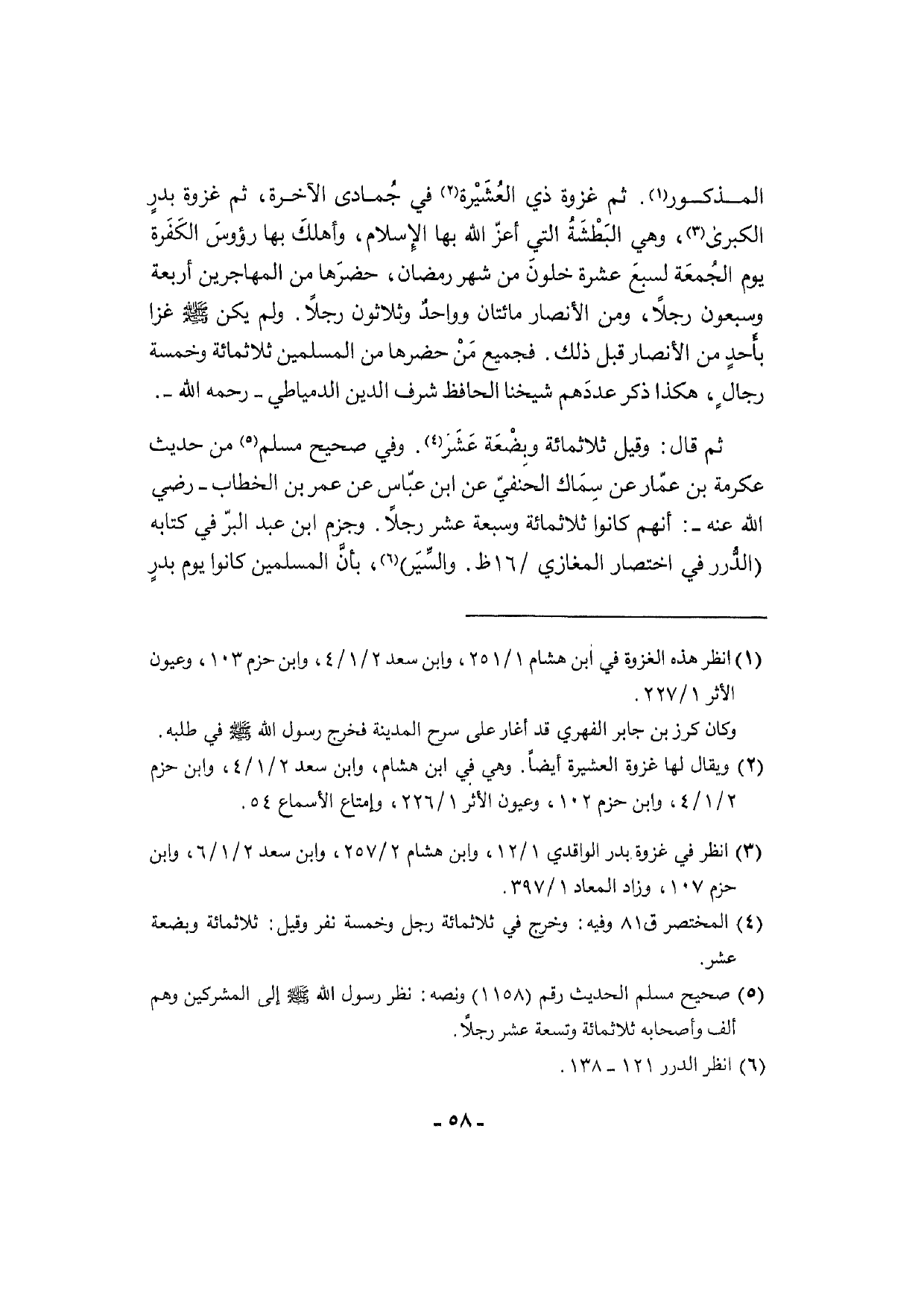 الْمَذْكُور. ثمَّ غَزْوَة ذِي العُشَيْرة فِي جُمادى الْآخِرَة، ثمَّ غَزْوَة بدرٍ الْكُبْرَى، وَهِي البَطْشَةُ الَّتِي أعزّ الله بهَا الإِسلام، وأهلكَ بهَا رُؤُوس الكَفَرة يَوْم الجُمعَة لسبعَ عشرَة خلونَ من شهر رَمَضَان، حضرَها من الْمُهَاجِرين أَرْبَعَة وَسَبْعُونَ رجلا، وَمن الْأَنْصَار مِائَتَان وواحدٌ وَثَلَاثُونَ رجلا. وَلم يكن [صلى الله عَلَيْهِ وَسلم] غزا بأَحدٍ من الْأَنْصَار قبل ذَلِك. فَجَمِيع مَنْ حضرها من الْمُسلمين ثَلَاثمِائَة وَخَمْسَة رجالٍ، هَكَذَا ذكر عددَهم شَيخنَا الْحَافِظ شرف الدّين الدمياطي - رَحمَه الله -.