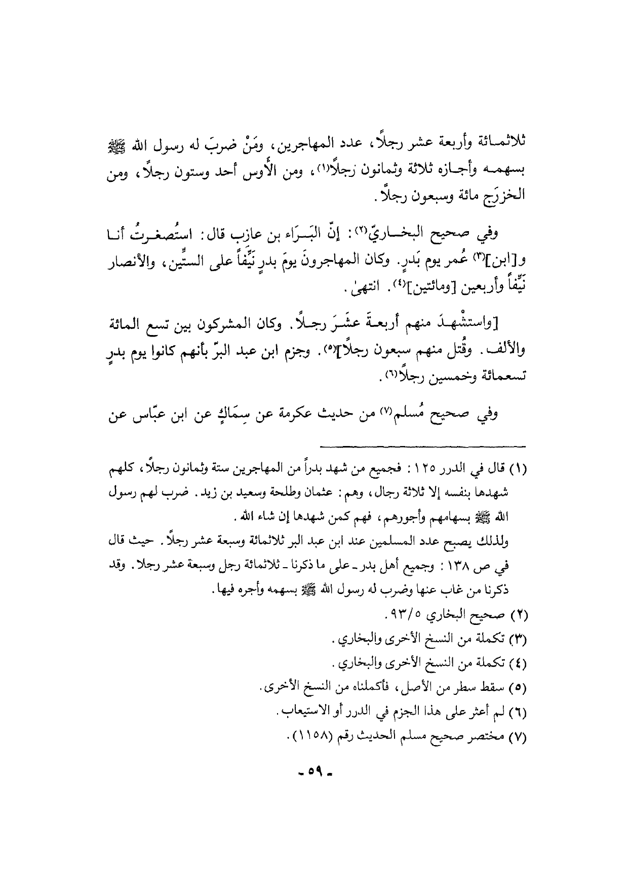 وَفِي صَحِيح البُخَارِيّ: إنّ البَرَاء بن عَازِب قَالَ: استُصغرتُ أَنا و [ابْن] عُمر يَوْم بَدرٍ. وَكَانَ المهاجرونَ يومَ بدرٍ نَيِّفاً على الستِّين، وَالْأَنْصَار نَيِّفاً وَأَرْبَعين [وَمِائَتَيْنِ] . انْتهى. [واستشْهد مِنْهُم أَرْبَعَة عشَرَ رجلا. وَكَانَ الْمُشْركُونَ بَين تسع الْمِائَة وَالْألف. وقُتل مِنْهُم سَبْعُونَ رجلا] . وَجزم ابْن عبد البرّ بِأَنَّهُم كَانُوا يَوْم بدرٍ تِسْعمائَة وَخمسين رجلا.