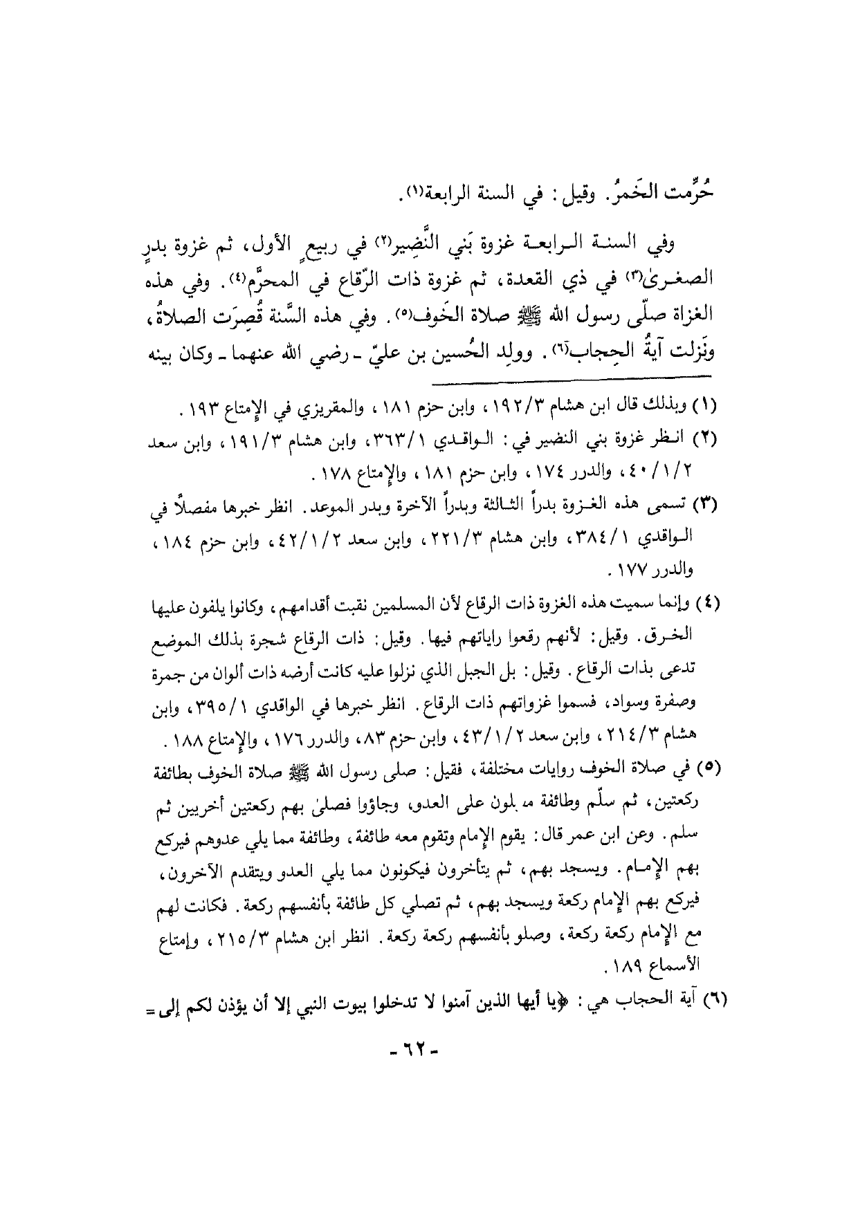 وَفِي السّنة الرَّابِعَة غَزْوَة بَني النَّضِير فِي ربيع الأول، ثمَّ غَزْوَة بدرٍ الصُّغْرَى فِي ذِي الْقعدَة، ثمَّ غَزْوَة ذَات الرّقاع فِي المحرَّم. وَفِي هَذِه الْغُزَاة صلّى سَوَّلَ الله [صلى الله عَلَيْهِ وَسلم] صَلَاة الخَوف. وَفِي هَذِه السَّنة قُصِرَت الصلاةُ، ونَزلت آيةُ الحِجاب. وولِد الحُسين بن عليّ - رَضِي الله عَنْهُمَا - وَكَانَ بَينه