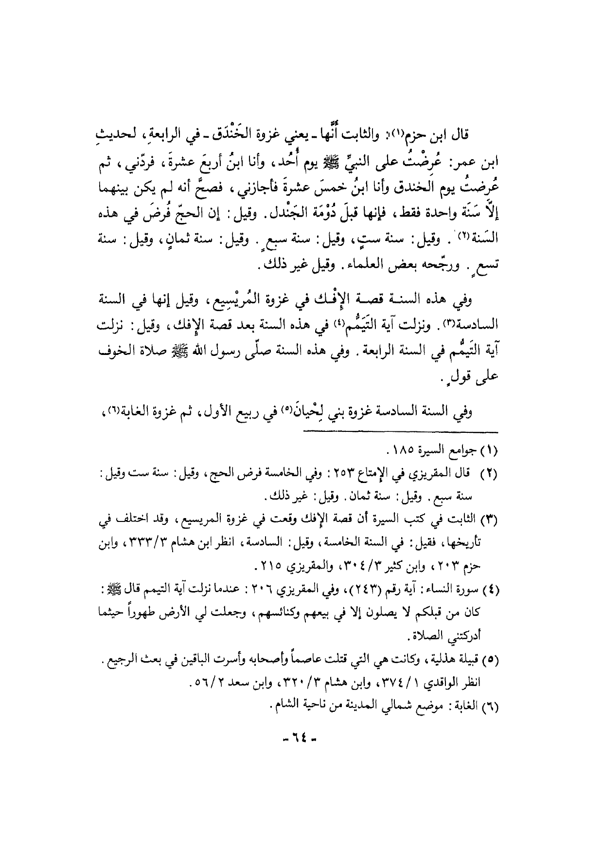 قَالَ ابْن حزم: وَالثَّابِت أَنَّها - يَعْنِي غَزْوَة الخَنْدَق - فِي الرابعةِ، لحديثِ ابْن عمر: عُرِضْتُ على النبيِّ [صلى الله عَلَيْهِ وَسلم] يَوْم أُحُد، وَأَنا ابنُ أربعَ عشرةَ، فردّني، ثمَّ عُرضتُ يَوْم الخَنْدَق وَأَنا ابنُ خمسَ عشرةَ فأجازني، فصحَّ أَنه لم يكن بَينهمَا إلاَّ سَنَة وَاحِدَة فَقَط، فَإِنَّهَا قبلَ دُوْمَة الجَنْدل. وَقيل: إِن الحجّ فُرضَ فِي هَذِه السَنة. وَقيل: سنة ستٍ، وَقيل: سنة سبعٍ. وَقيل: سنة ثمانٍ، وَقيل: سنة تسعٍ. ورجّحه بعض الْعلمَاء. وَقيل غير ذَلِك.