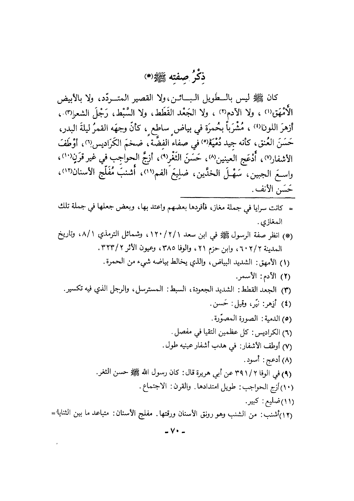 كَانَ [صلى الله عَلَيْهِ وَسلم] لَيْسَ بالطويل الْبَائِن، وَلَا الْقصير المتردّد، وَلَا بالأبيض الأَمْهَق، وَلَا الآدم، وَلَا الجَعْد القَطَط، وَلَا السَّبْط، رَجْلَ الشّعْر، أزهرَ اللَّوْن، مُشْرَباً بحُمرَة فِي بياضٍ ساطعٍ، كأنّ وجهَه القمرُ ليلةَ الْبَدْر، حَسَنَ العُنق، كَأَنَّهُ جِيد دُمْيَة فِي صفاء الفِضَّة، ضخمَ الكَرَاديس، أوْطَفَ الأشفار، أَدْعَج الْعَينَيْنِ، حَسَنَ الثَغْرِ، أزجَّ الحواجِب فِي غير قرَنٍ، واسعَ الجبين، سَهْلَ الخدَّين، ضلِيعَ الْفَم، أَشنبَ مُفَلّج الْأَسْنَان، حَسَن الْأنف.