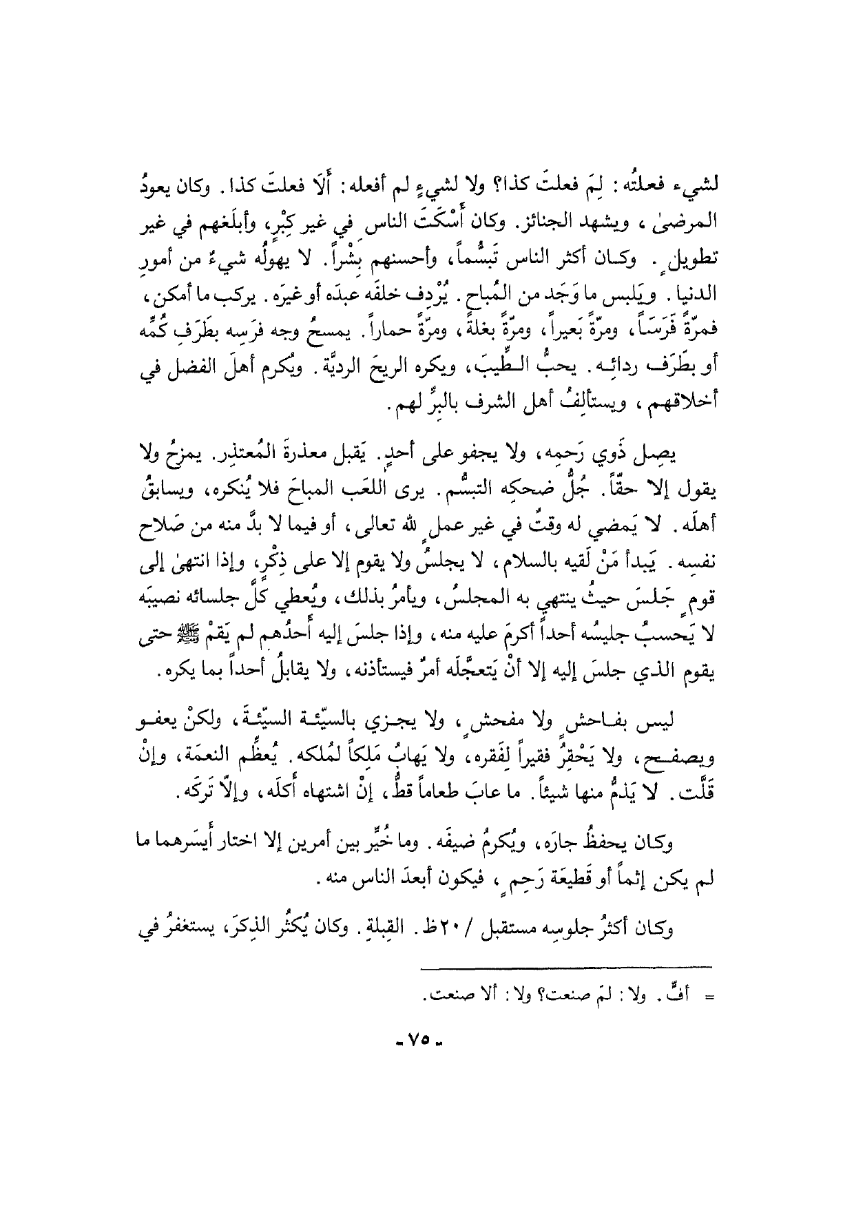 لشَيْء فعلتُه: لِمَ فعلتَ كَذَا؟ وَلَا لشيءٍ لم أَفعلهُ: أَلا فعلتَ كَذَا. وَكَانَ يعودُ المرضى، وَيشْهد الْجَنَائِز. وَكَانَ أَسْكَتَ النَّاس فِي غير كِبْرٍ، وأبلَغهم فِي غير تطويلٍ. وَكَانَ أَكثر النَّاس تَبسُّماً، وَأَحْسَنهمْ بِشْراً. لَا يهولُه شيءٌ من أمورِ الدُّنْيَا. ويَلبس مَا وَجَد من المُباحٍ. يُرْدِف خلفَه عبدَه أَو غيرَه. يركب مَا أمكن، فمرّةً فَرَسَاً، ومرّةً بَعيراً، ومرّةً بغلة، ومرّةً حمارا، يمسحُ وَجه فَرسِه بطَرَفِ كُمِّه أَو بطَرَف ردائِه. يحبُّ الطِّيبَ، وَيكرهُ الريحَ الرديَّة. ويُكرم أهلَ الْفضل فِي أَخْلَاقهم، ويستألِفُ أهل الشّرف بالبِرِّ لَهُم.