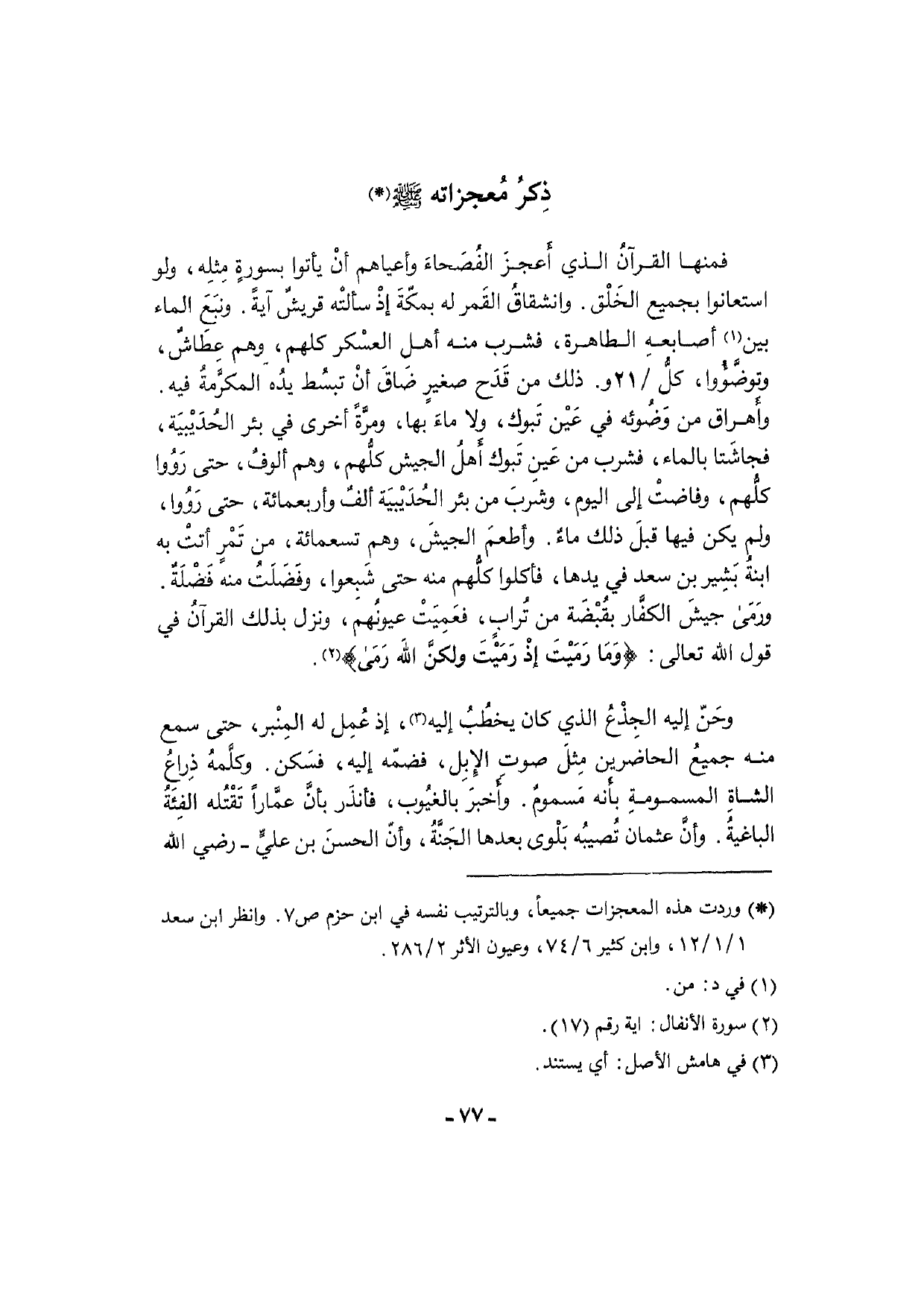 فَمِنْهَا القرآنُ الَّذِي أًعجزَ الفُصَحاءَ وأعياهم أنْ يَأْتُوا بسورةٍ مِثلِه، وَلَو استعانوا بِجَمِيعِ الخَلْق. وانشقاقُ القَمر لَهُ بمكّةَ إذْ سألتْه قريشٌ آيَة. ونبَعَ المَاء بَين أَصَابِعه الطاهرة، فَشرب مِنْهُ أهل العسْكر كلهم، وهم عِطَاشٌ، وتوضَّؤُوا، كلُّ / 21 و. ذَلِك من قَدَح صغيرٍ ضَاقَ أنْ تبسُط يدُه المكرَّمةً فِيهِ. وأَهراق من وَضُوئه فِي عَيْن تَبوك، وَلَا ماءَ بهَا، ومرَّةً أُخْرَى فِي بِئْر الحُديْبيَة، فجاشَتا بِالْمَاءِ، فَشرب من عَين تَبوك أَهلُ الْجَيْش كلُّهم، وهم ألوفٌ، حَتَّى رَوُوا كلُّهم، وفاضتْ إِلَى الْيَوْم، وشربَ من بِئْر الحُدَيْبيَة ألفٌ وَأَرْبَعمِائَة، حَتَّى رَوُوا، وَلم يكن فِيهَا قبل ذَلِك ماءٌ. وأطعمَ الجيشَ، وهم تِسْعمائَة، من تَمْرٍ أتتْ بِهِ ابنةُ بَشِير بن سعد فِي يَدهَا، فَأَكَلُوا كلُّهم مِنْهُ حَتَّى شَبِعوا، وفَضَلَتُ مِنْهُ فَضْلَةٌ. ورَمَى جيشَ الكفّار بقُبْضَة من تُرابٍ، فعَمِيَتْ عيونُهم، وَنزل بذلك القرآنُ فِي قَول الله تَعَالَى: {وَمَا رَمَيْتَ إِذا رميت ولكنَّ الله رَمَى} .