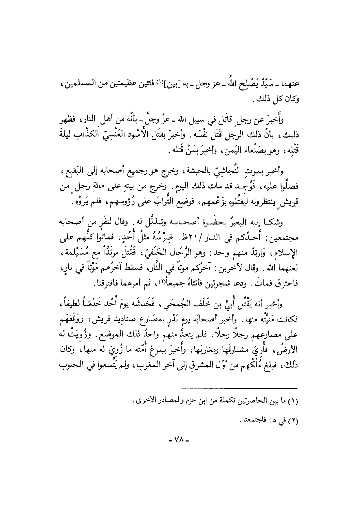 وأَخبرَ عَن رجلٍ قاتَل فِي سَبِيل الله - عزَّ وجلَّ - بأنَّه من أهلِ النَّار، فَظهر ذَلِك، بأنّ ذَلِك الرجل قَتَل نفْسَه. وأخبرَ بقتْل الأَسْود العَنْسِيّ الكذَّاب ليلةَ قَتْلِه، وَهُوَ بصَنْعاء اليَمن، وأخبرَ بمَنْ قَتله.