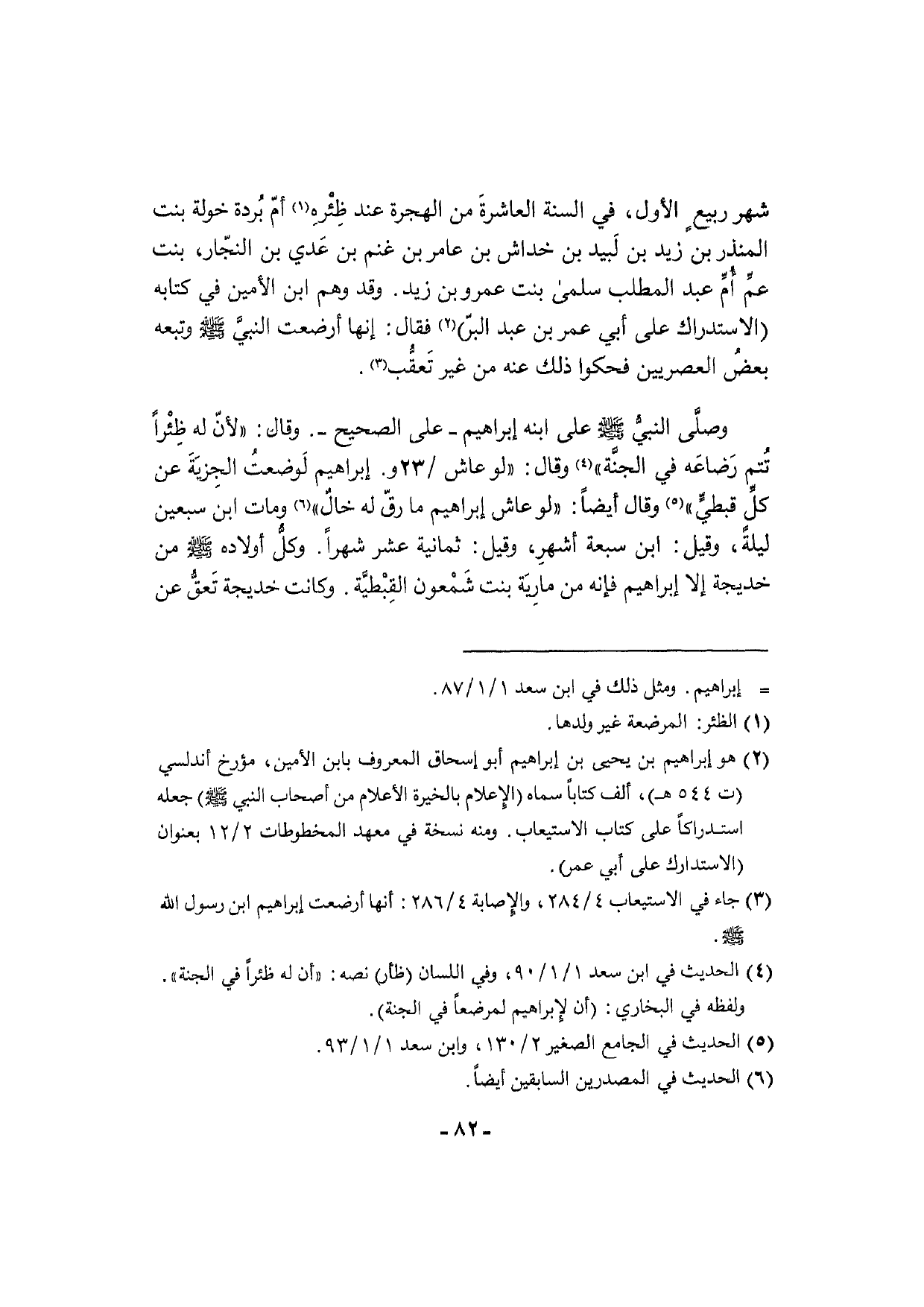 وصلَّى النبيُّ [صلى الله عَلَيْهِ وَسلم] على ابْنه إِبْرَاهِيم - على الصَّحِيح - وَقَالَ: " لأنّ لَهُ ظِئْراً تُتم رَضاعَه فِي الجنَّة " وَقَالَ: " لَو عَاشَ / 23 و. إِبْرَاهِيم لَوضعتُ الجِزيَةَ عَن كلِّ قبطيٍّ " وَقَالَ أَيْضا: " لَو عَاشَ إِبْرَاهِيم مَا رقّ لَهُ خالٌ " وَمَات ابْن سبعين لَيْلَة، وَقيل: ابْن سَبْعَة أشهرِ، وَقيل: ثَمَانِيَة عشر شهرا، وكلُّ أَوْلَاده [صلى الله عَلَيْهِ وَسلم] من خَدِيجَة إِلَّا إِبْرَاهِيم فَإِنَّهُ من مارِيَة بنت شَمْعون القِبْطيَّة. وَكَانَت خَدِيجَة تَعقُّ عَن