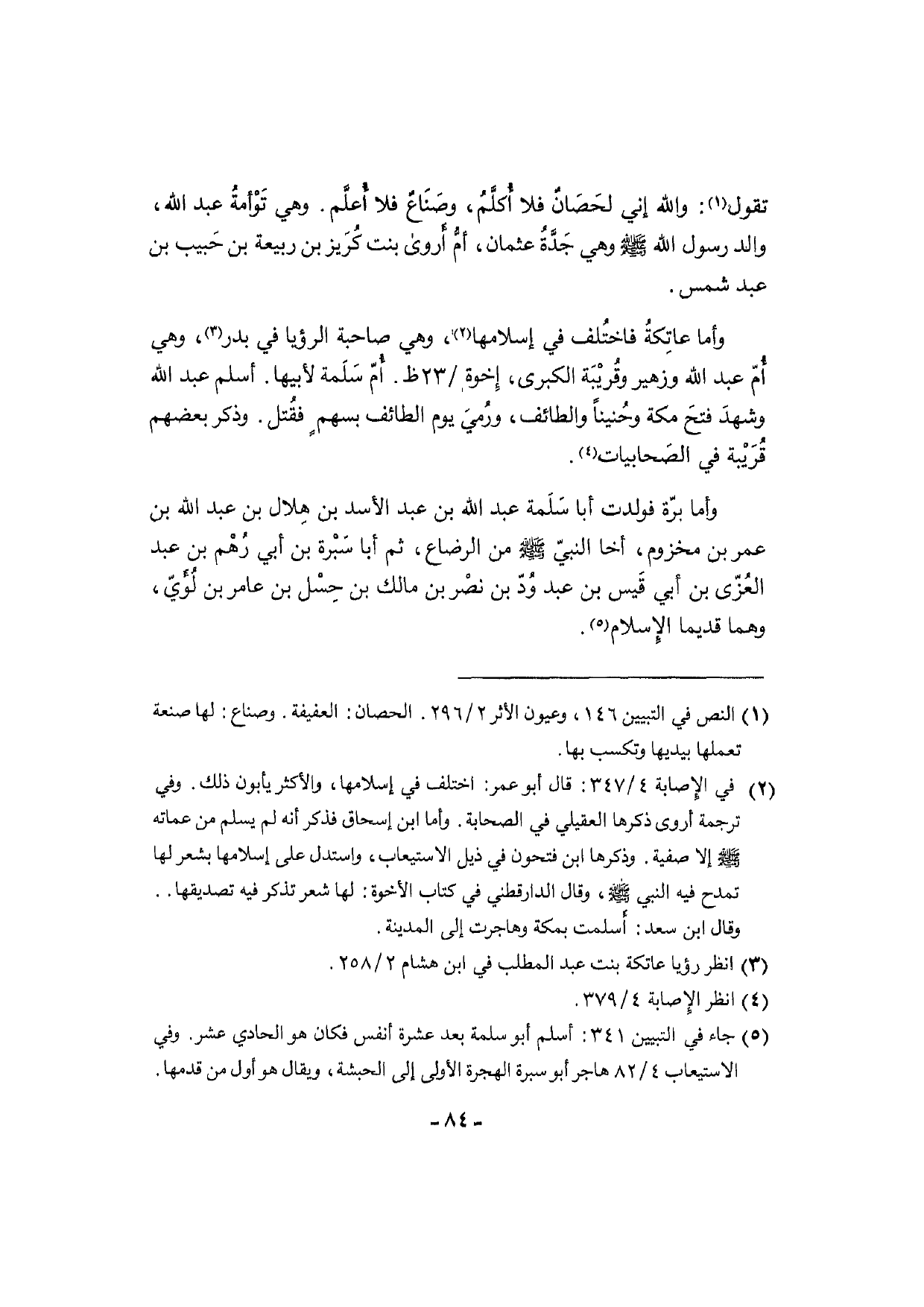 وَأما عاتِكةُ فاختُلف فِي إسْلَامهَا، وَهِي صَاحِبَة الرُّؤْيَا فِي بدر، وَهِي أُمّ عبد الله وَزُهَيْر وقُريْبَة الْكُبْرَى، إِخوة / 23 ظ. أُمّ سَلَمة لأَبِيهَا. أسلم عبد الله وشهدَ فتحَ مَكَّة وحُنيناً والطائف، ورُميَ الطَّائِف بسهمٍ فقُتل. وَذكر بَعضهم قُرَيْبة فِي الصَحابيات.