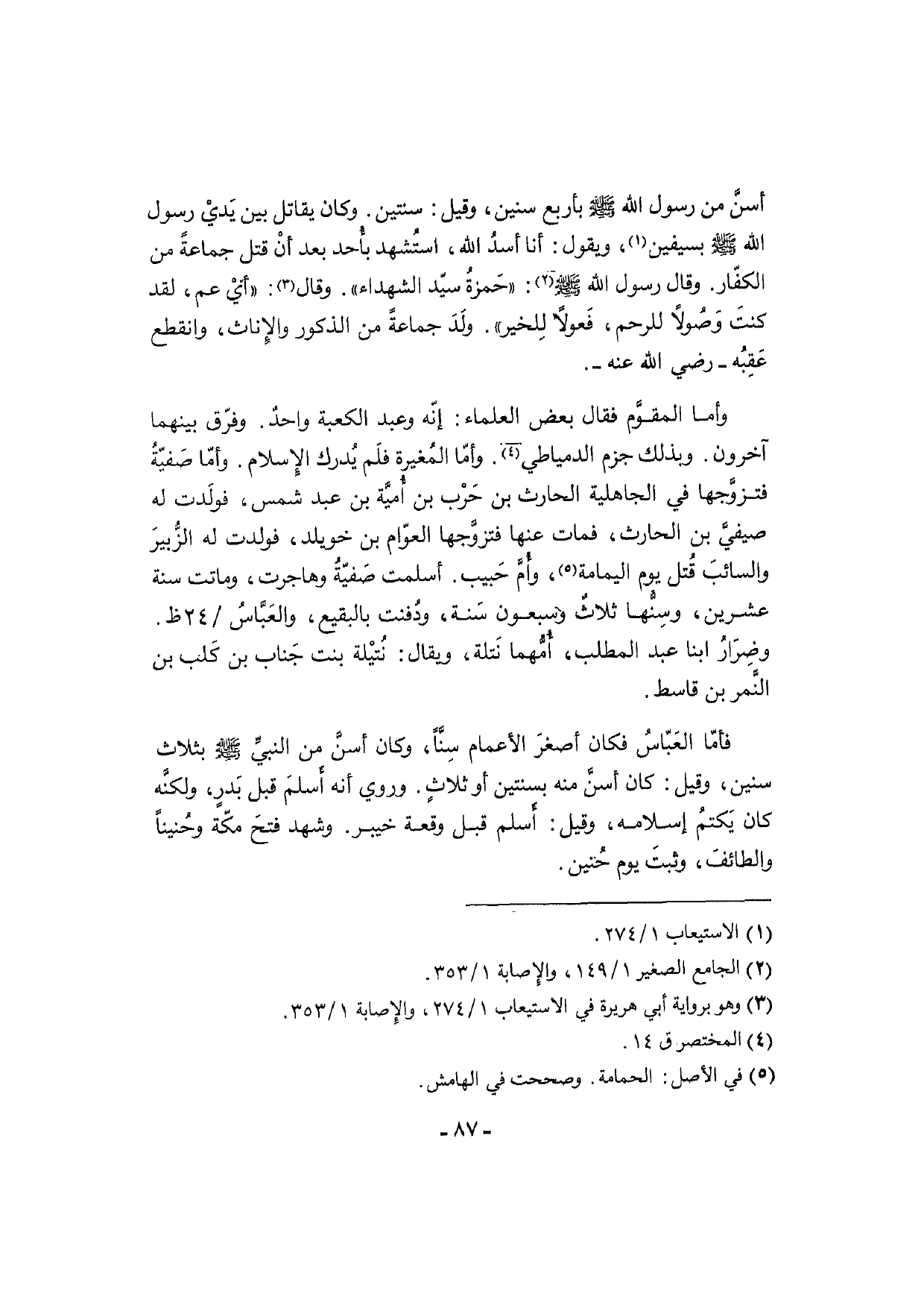 وَأما المقوَّم فَقَالَ بعض الْعلمَاء: إنّه وَعبد الْكَعْبَة واحدٌ. وفرّق بَينهمَا آخَرُونَ. وَبِذَلِك جزم الدمياطي. وأمّا المُغيرة فلَم يُدرك الإِسلام. . وأمّا صَفيّةُ فتزوَّجها فِي الْجَاهِلِيَّة الْحَارِث بن حَرْب بن أُميَّة بن عبد شمس، فولَدت لَهُ صيفيَّ بن الْحَارِث، فَمَاتَ عَنْهَا فتزوَّجها العوّام بن خويلد، فَولدت لَهُ الزُّبيرَ والسائب قُتل يَوْم الْيَمَامَة، وأُمَّ حَبيب. أسلمت صَفيّةُ وَهَاجَرت، وَمَاتَتْ سنة عشْرين، وسِنُّها ثلاثٌ وَسَبْعُونَ سَنة، ودُفنت بِالبَقِيعِ، والعَبَّاسُ / 24 ظ. وضِرَارُ ابْنا عبد الْمطلب، أُمُّهما نَتلة، وَيُقَال: نُتْيلة بنت جَناب بن كَلب بن النَّمر بن قاسط.