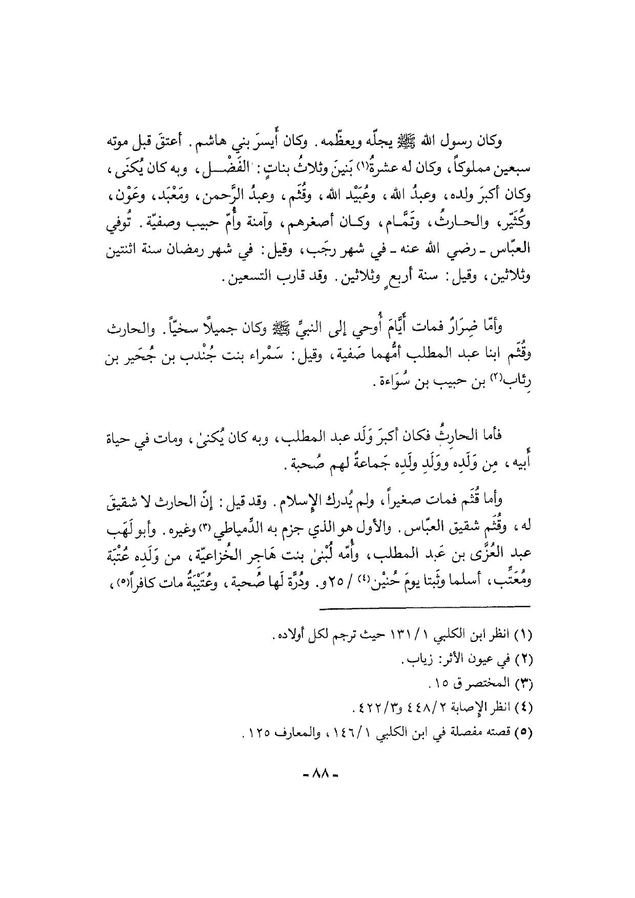 وَأما قُثَم فَمَاتَ صَغِيرا، وَلم يُدرك الإِسلام. وَقد قيل: إنّ الْحَارِث لَا شقيقَ لَهُ، وقُثَم شَقِيق العبّاس. وَالْأول هُوَ الَّذِي جزم بِهِ الدِّمياطي وَغَيره. وَأَبُو لَهَب عبد العُزَّى بن عَبد الْمطلب، وأُمّه لُبْنى بنت هَاجِر الخُزاعيّة، من وَلَدِه عُتْبَة ومُعَتِّب، أسلما وثَبتا يومَ حُنْين / 25 و. ودُرَّة لَها صُحبة، وعُتَيْبَةُ مَاتَ كَافِرًا،