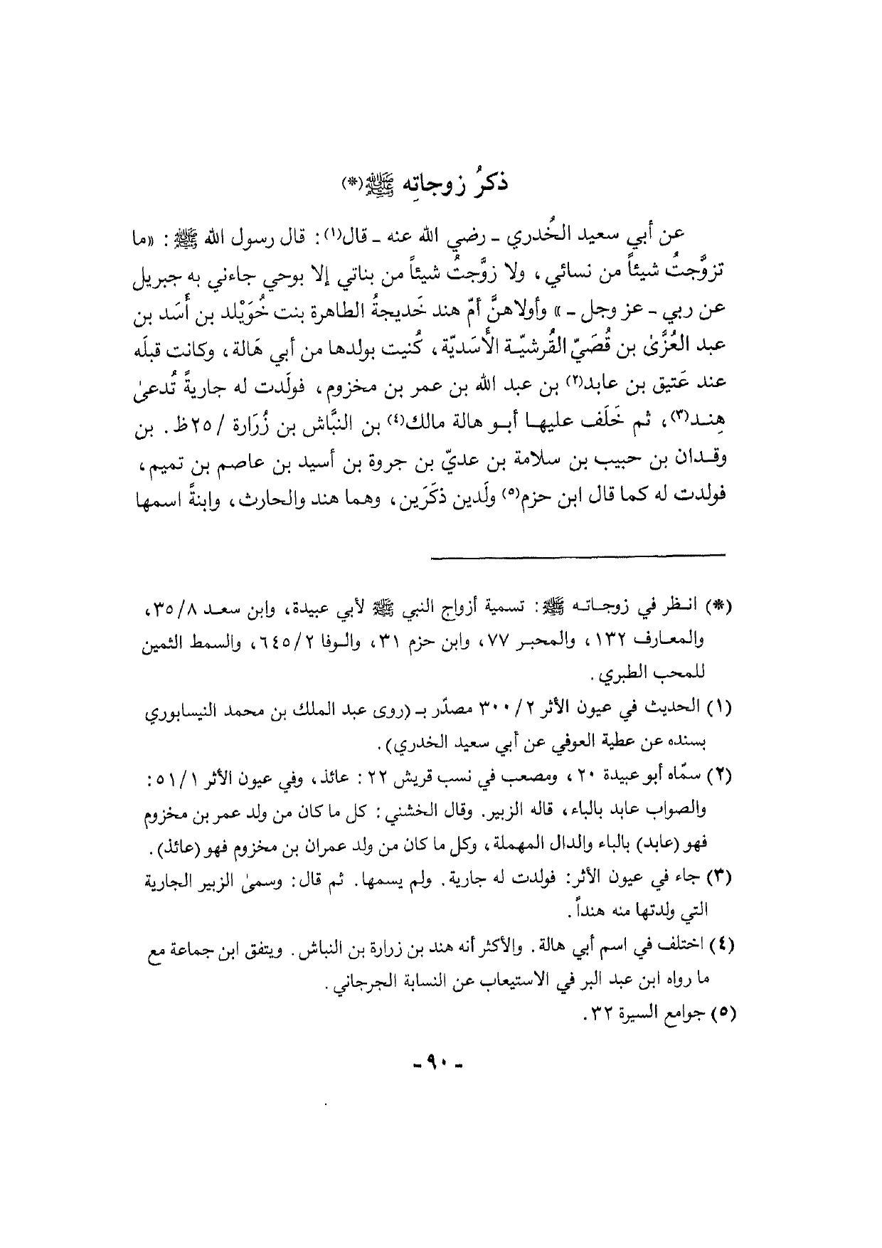 عَن أبي سعيد الخُدري - رَضِي الله عَنهُ - قَالَ: قَالَ رَسُول الله [صلى الله عَلَيْهِ وَسلم] : " مَا تزوَّجتُ شَيْئا من نسَائِي، وَلَا زوَّجتُ شَيْئا من بَنَاتِي إِلَّا بِوَحْي جَاءَنِي بِهِ جِبْرِيل عَن رَبِّي - عز وَجل - " وأولاهنَّ أمّ هِنْد خَديجةُ الطاهرة بنت خُوَيْلد بن أَسَد بن عبد العُزَّى بن قُصَيّ القُرشيّة الأَسَديّة، كُنيت بِوَلَدِهَا من أبي هَالة، وَكَانَت قبلَه عِنْد عَتيق بن عَابِد بن عبد الله بن عمر بن مَخْزُوم، فولَدت لَهُ جَارِيَة تُدعى هِند، ثمَّ خَلَف عَلَيْهَا أَبُو هَالة مَالك بن النبَّاش بن زُرَارة / 25 ظ. بن وقدان بن حبيب بن سَلامَة بن عديّ بن جروة بن أسيد بن عَاصِم بن تَمِيم، فَولدت لَهُ كَمَا قَالَ ابْن حزم ولَدين ذكَرَين، وهما هِنْد والْحَارث، وَابْنَة اسْمهَا