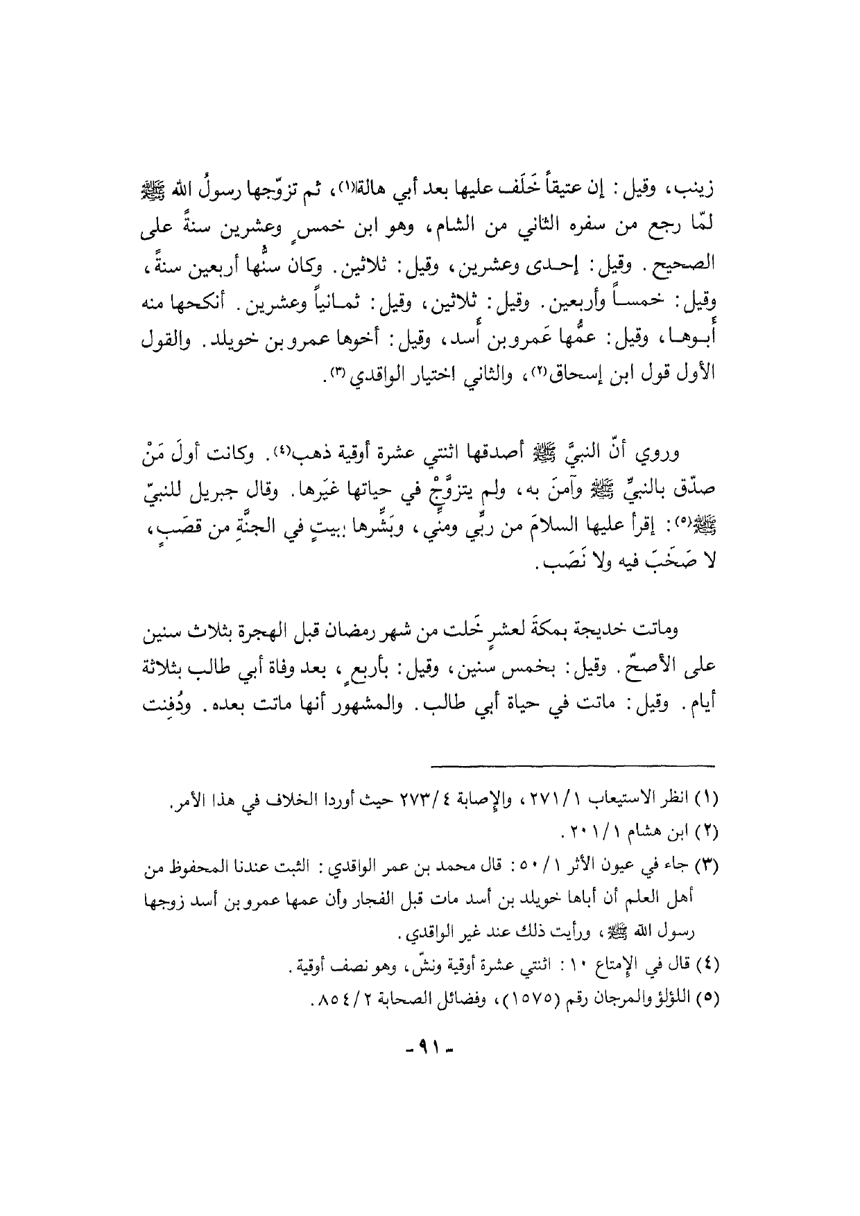 زَيْنَب، وَقيل: إِن عتيقاً خَلَف عَلَيْهَا بعد أبي هَالة، ثمَّ تزوجّها رسولُ الله [صلى الله عَلَيْهِ وَسلم] لما رَجَعَ من سَفَره الثَّانِي من الشَّام، وَهُوَ ابْن خمسٍ وَعشْرين سنة على الصَّحِيح. وَقيل: إِحْدَى وَعشْرين، وَقيل: ثَلَاثِينَ. وَكَانَ سنُّها أَرْبَعِينَ سنة، وَقيل: خمْسا وَأَرْبَعين. وَقيل: ثَلَاثِينَ، وَقيل: ثمانياً وَعشْرين. أنْكحهَا مِنْهُ أَبوها، وَقيل: عمُّها عَمرو بن أَسد، وَقيل: أَخُوهَا عَمْرو بن خويلد. وَالْقَوْل الأول قَول ابْن إِسْحَاق، وَالثَّانِي اخْتِيَار الْوَاقِدِيّ.