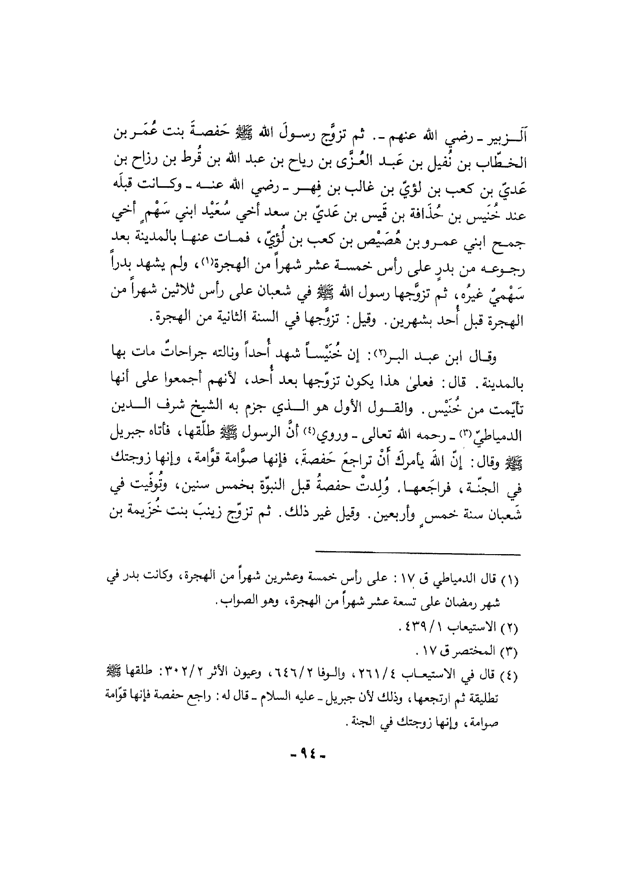 وَقَالَ ابْن عبد الْبر: إِن خُنَيْساً شهد أُحداً ونالته جراحاتٌ مَاتَ بهَا بِالْمَدِينَةِ. قَالَ: فعلى هَذَا يكون تزوّجها بعد أُحد، لأَنهم أَجمعُوا على أَنَّهَا تأيّمت من خُنَيْس. وَالْقَوْل الأول هُوَ الَّذِي جزم بِهِ الشَّيْخ شرف الدّين الدمياطيّ - رَحْمَة الله تَعَالَى - وَرُوِيَ أنَّ الرَّسُول [صلى الله عَلَيْهِ وَسلم] طلّقها، فَأَتَاهُ جِبْرِيل [صلى الله عَلَيْهِ وَسلم] وَقَالَ: إنّ الله يأمركَ أَنْ تراجعَ حَفصةَ، فَإِنَّهَا صوَّامة قوَّامة، وَإِنَّهَا زَوجتك فِي الجنّة، فراجَعها. وُلِدتْ حفصةُ قبل النبوّة بِخمْس سِنِين، وتُوفّيت فِي شَعبان سنة خمسٍ وَأَرْبَعين. وَقيل غير ذَلِك. ثمَّ تزوّج زينبَ بنت خُزَيمة بن
