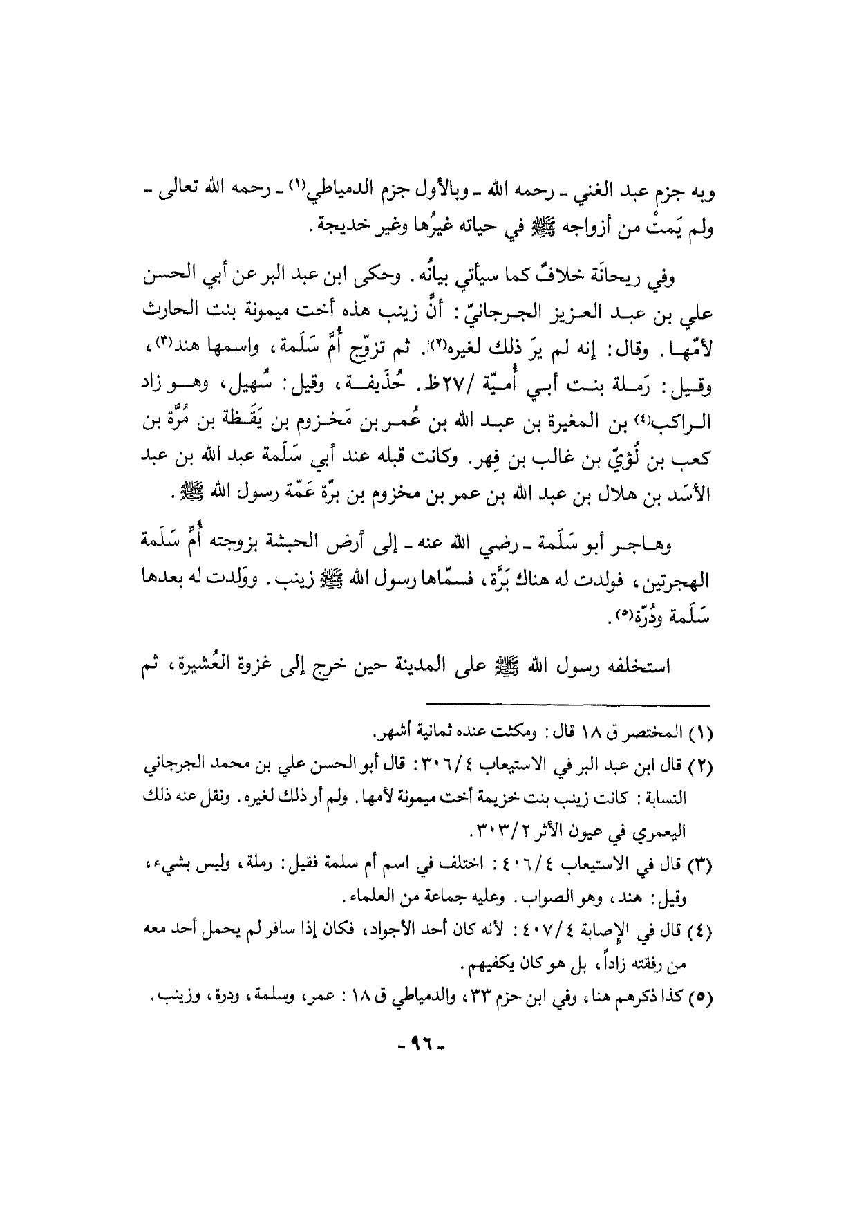 وَفِي ريحانَة خلافٌ كَمَا سَيَأْتِي بيانُه. وَحكى ابْن عبد الْبر عَن أبي الْحسن عَليّ بن عبد الْعَزِيز الجرجانيّ: أنَّ زَيْنَب هَذِه أُخْت مَيْمُونَة بنت الْحَارِث لأمّها. وَقَالَ: إِنَّه لم يرَ ذَلِك لغيره. ثمَّ تزوّج أُمَّ سَلَمة، وَاسْمهَا هِنْد، وَقيل: رَملة بنت أبي أُميّة / 27 ظ. حُذَيفة، وَقيل: سُهيل، وَهُوَ زَاد الرَّاكِب بن الْمُغيرَة بن عبد الله بن عُمر بن مَخزوم بن يَقَظة بن مُرَّة بن كَعْب بن لُؤيّ بن غَالب بن فِهر. وَكَانَت قبله عِنْد أبي سَلَمة عبد الله بن عبد الأسَد بن هِلَال بن عبد الله بن عمر بن مَخْزُوم بن برّة عَمّة رَسُول الله [صلى الله عَلَيْهِ وَسلم] .