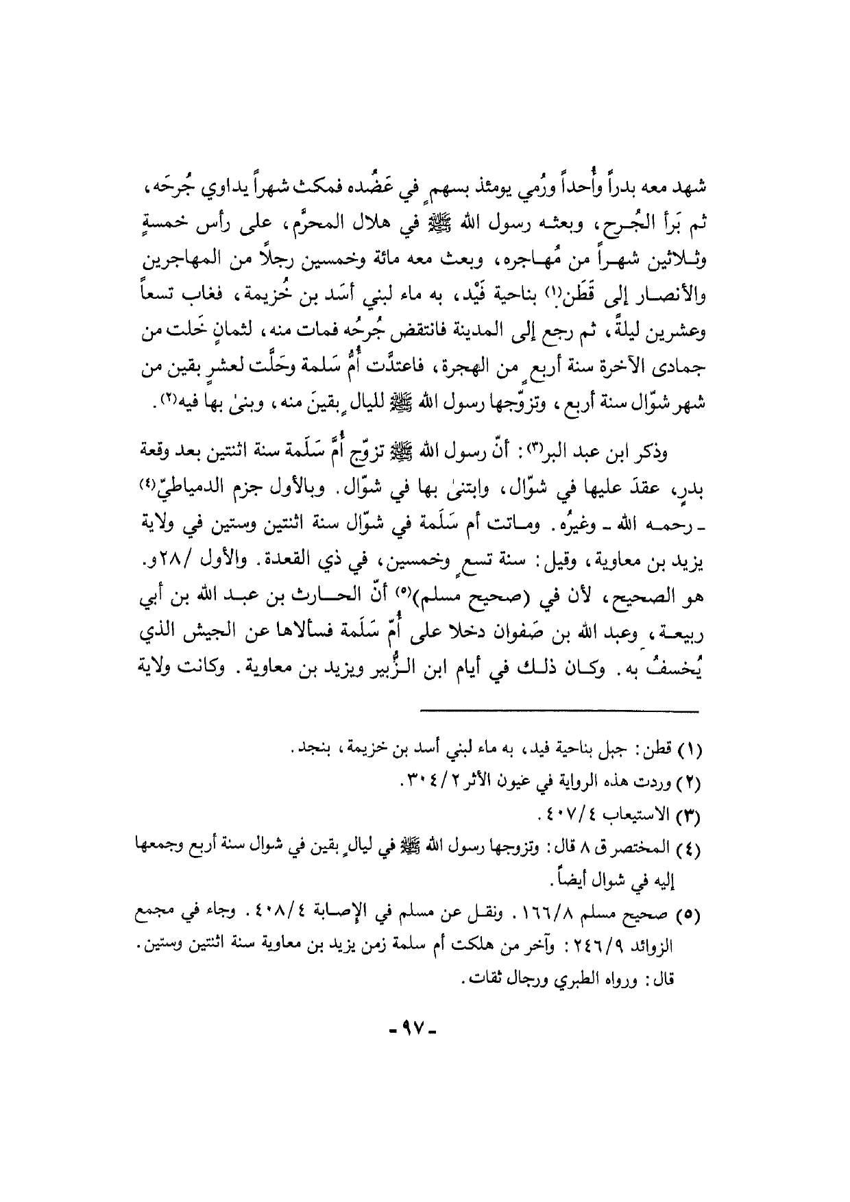 وَذكر ابْن عبد الْبر: أنّ رَسُول الله [صلى الله عَلَيْهِ وَسلم] تزوّج أُمَّ سَلَمة سنة اثْنَتَيْنِ بعد وقْعَة بدرٍ، عقدَ عَلَيْهَا فِي شوّال، وابتنى بهَا فِي شوّال. وبالأول جزم الدمياطيّ - رَحمَه الله - وغيرُه. وَمَاتَتْ أم سَلَمة فِي شوّال سنة اثْنَتَيْنِ وَسِتِّينَ فِي ولَايَة يزِيد بن مُعَاوِيَة، وَقيل: سنة تسعٍ وَخمسين، فِي ذِي الْقعدَة. وَالْأول / 28 و. هُوَ الصَّحِيح، لِأَن فِي (صَحِيح مُسلم) أنّ الْحَارِث بن عبد الله بن أبي ربيعَة، وَعبد الله بن صَفوان دخلا على أُمّ سَلَمة فَسَأَلَاهَا عَن الْجَيْش الَّذِي يُخسفُ بِهِ. وَكَانَ ذَلِك فِي أَيَّام ابْن الزُّبير وَيزِيد بن مُعَاوِيَة. وَكَانَت ولَايَة