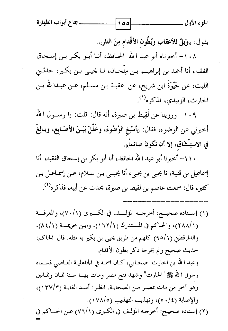 200 وأخبرنا ابو بكر محمد بن الحسن بن فورك أنا عبد الله بن جعفر نا يونس بن حبيب نا أبو داود الطيالسي نا حماد بن سلمة عن عاصم بن المنذر قال كنا مع ابن لابن عمر في البستان وثم جلد بعير في ماء فتوضأ منه فقلت أتفعل هذا فقال حدثني ابي عن النبي صلى الله عليه وسلم قال إذا كان الماء قدر قلتين لم ينجسه شيء