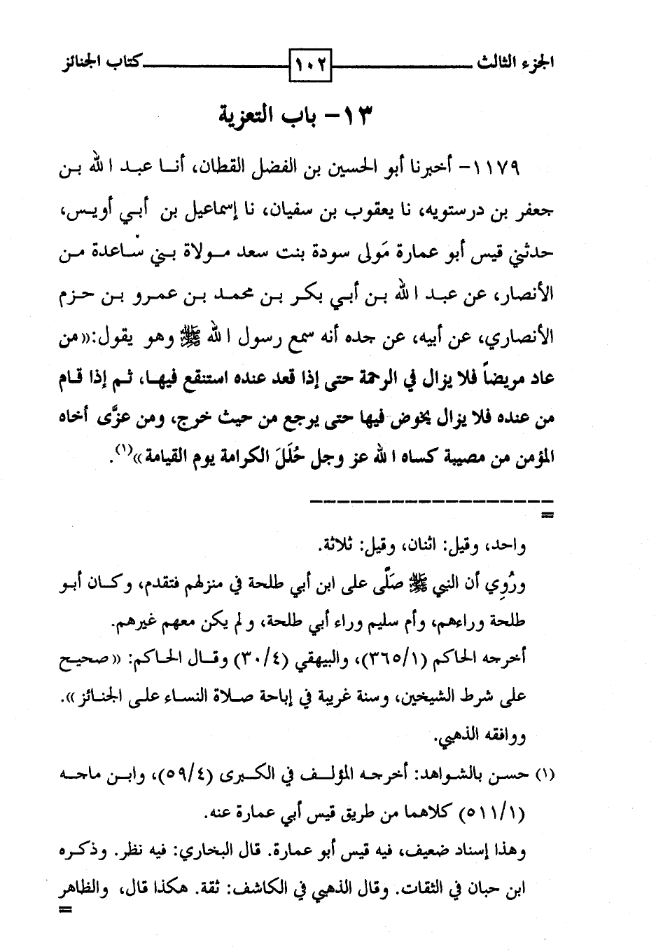 1179 - أخبرنا أبو الحسين بن الفضل القطان ، أنا عبد الله بن جعفر بن درستويه ، نا يعقوب بن سفيان ، نا إسماعيل بن أبي أويس ، حدثني قيس أبو عمارة مَولى سودة بنت سعد مولاة بني ساعدة من الأنصار ، عن عبد الله بن أبي بكر بن محمد بن عمرو بن حزم الأنصاري ، عن أبيه ، عن جده أنه سمع رسول الله [ صلى الله عليه وسلم ] وهو يقول : ' من عاد مريضاً فلا يزال في الرحمة حتى إذا قعد عنده استنقع فيها ، ثم إذا قام من عنده فلا يزال يخوض فيها حتى يرجع من حيث خرج ، ومن عزَّى أخاه المؤمن من مصيبة كساه الله عز وجل حُلَلَ الكرامة يوم القيامة ' ( 1 ) .