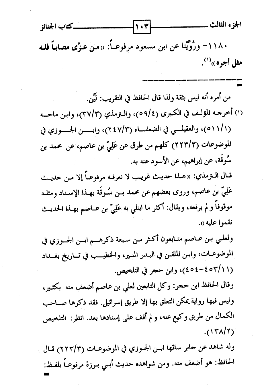 1180 - ورُوِّيْنا عن ابن مسعود مرفوعاً : ' من عزَّى مصاباً فله مثل أجره ' ( 1 ) .