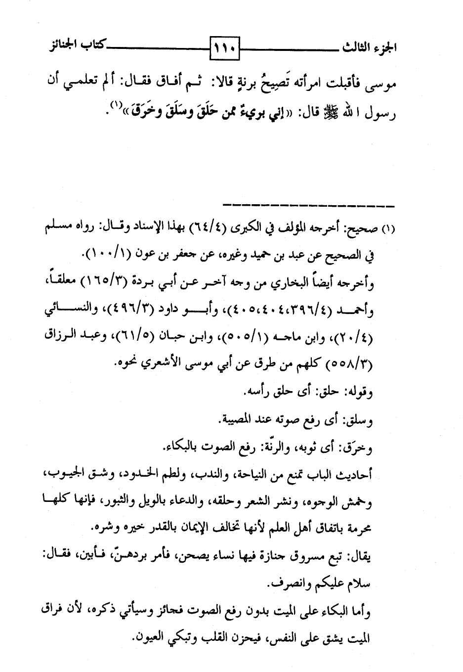 موسى فأقبلت امرأته تَصِيحُ برنةٍ قالاً : ثم أفاق فقال : ألم تعلمي أن رسول الله [ صلى الله عليه وسلم ] قال : ' إني بريءٌ ممن حَلَقَ وسَلَق وخَرَقَ ' ( 1 ) .