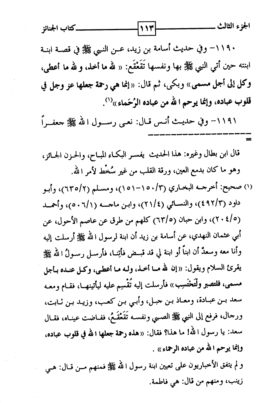 1190 - وفي حديث أسامة بن زيد ، عن النبي [ صلى الله عليه وسلم ] في قصة ابنة ابنته حين أتي النبي [ صلى الله عليه وسلم ] بها ونفسها تَقَعْقَع : ' لله ما أخذ والله ما أعطى ، وكل إلى أجل مسمى ' وبكى ، ثم قال : ' إنما هي رحمة جعلها عز وجل في قلوب عباده ، وإنما يرحم الله من عباده الرُحَماء ' ( 1 ) .