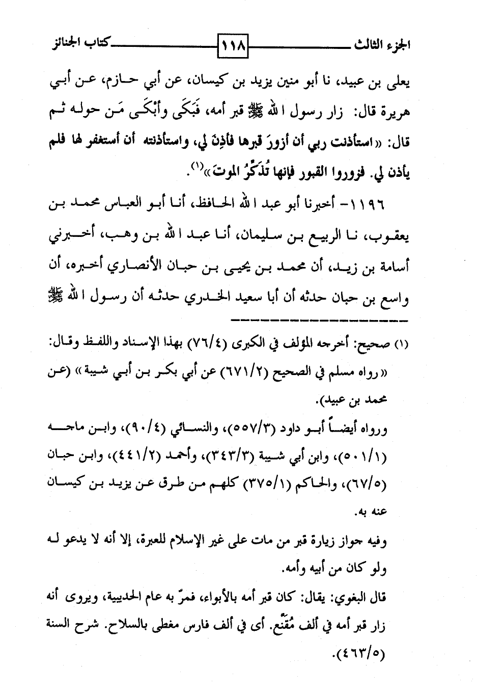 يعلى بن عبيد ، نا أبو منين يزيد بن كيسان ، عن أبي حازم ، عن أبي هريرة قال : زار رسول الله [ صلى الله عليه وسلم ] قبر أمه ، فَبَكَى وأَبْكَى مَن حوله ثم قال : ' استأذنت ربي أن أزور قبرها فأذِن لي ، واستأذنته أن استغفر لها فلم يأذن لي . فزوروا القبور فإنها تُذَكَّرُ الموت ' ( 1 ) .