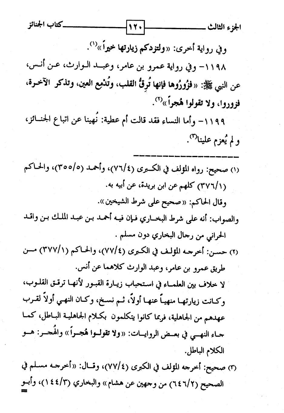 1198 - وفي رواية عمرو بن عامر ، وعبد الوارث ، عن أنس ، عن النبي [ صلى الله عليه وسلم ] : ' فزُورُوها فإنها تُرِقُ القلب ، وتُدْمع العين ، وتذكر الآخرة فزوروا ، ولا تقولوا هُجراً ' ( 2 ) .